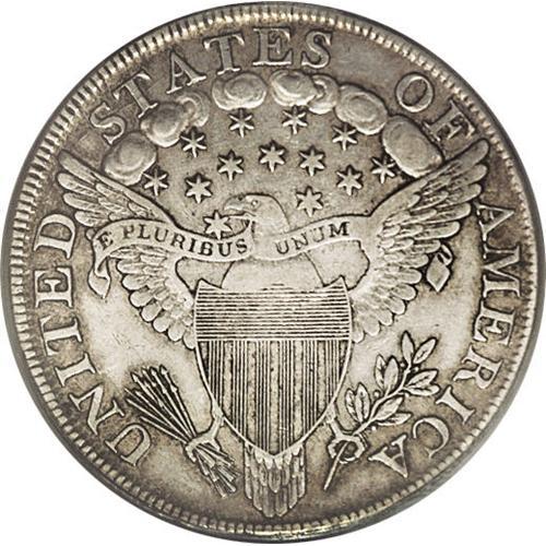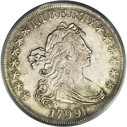 <B>1799<img border='0' src='http://www.heritagecoins.com/images/star.gif' width=10 height=10>$1> XF45 PCGS.</B></I> B-5, BB-157, R.2. Die State II. A gunmetal-blue and tan piece with sharp definition and faintly glossy surfaces. The reverse details may be the best that we have ever seen for a coin of this type, at the XF45 grade level. A reverse die crack traverses the entire left side, from the left side of the eagle's tail through UNITED and STATES. An attractive, lightly worn example, with a couple of wispy marks in the right obverse field, and a seemingly blemish-free reverse. One of the more plentiful varieties of the year.