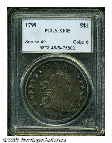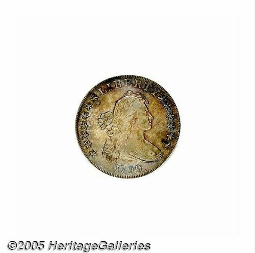 <B>1799<S$1> XF45 PCGS.</B></I> B-9, BB-166, R.2. Die State V. Rich navy-blue and golden-brown toning embraces this well struck and impressive early dollar. A late die state of the 'apostrophe' variety, named for a broad die crack after the final S in STATES. A small area of granularity near obverse star 7, otherwise the surfaces are surprisingly unmarked and display noticeable luster.
