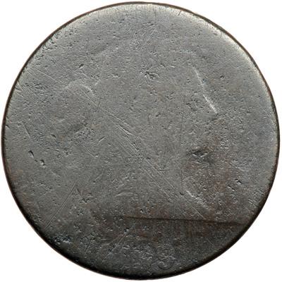 1799 S-189 R2+ Normal Date Basal State-1. Terminal Die State. Slightly glossy dark chocolate and steel brown. The surfaces are mostly smooth but not perfectly so, with microscopic porosity and faint hairline scratches visible on both sides. The date is weak but easily visible, especially the 99. The portrait is mostly visible but the legends are nearly gone, only small portions of the wreath remaining. Nothing special except for the die state. There appears to be a strong die failure causing a shelf from the shoulder to the rim at the bust tip, and the area below the failure is clearly lower than the portion above. This shelf follows the die crack described by Breen as his die state VI and plated in Penny Whimsy, but no other example has been reported with this massive failure along the die crack. Unfortunately the low grade of this example makes the exact nature of this failure uncertain. DWH #3171.