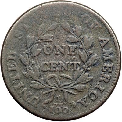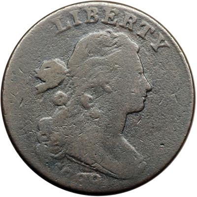 1799 S-189 R2+ Normal Date. Good-6. Slightly sharper but covered with uniform very fine granularity. No verdigris. The only marks of any note are a dull, light nick connecting the upper edges of the two 9's and a small pinprick under the I in AMERICA. The date is easily readable but the bottom edges of all 4 digits fade into the rim below. LIBERTY is strong, as is all the reverse except for TATES, which is faint due to the usual uneven strike. Slightly glossy dark chocolate brown. MDS, Breen state IV, with a thin rim cud break over AM in addition to the earlier one at F-A. DWH #0205.