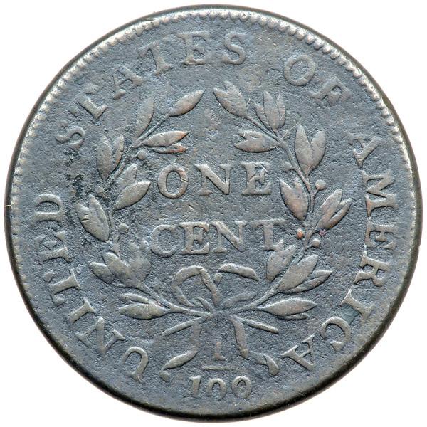 1799 S-189 R2 VG7. Sharpness F15 but covered with fine roughness, strongest in the protected areas. There are traces of very shallow planchet scale in some of the protected areas but no verdigris. The only notable marks are a small rim nick left of the upper edge of the hair ribbon and a couple tiny nicks at the base of the 17 in the date. Slightly glossy dark olive and steel with lighter chocolate brown toning on the highpoints. The obverse displays a considerable amount of gloss thanks to some very light burnishing done long ago, but the reverse is closer to matte. E-MDS, Breen state II. The shallow lump over T in CENT is present but weak and there is no die crumbling in the dentils at F-A. The bottom of the date is relatively weak, which Breen mentions as normal for this die state, while the legends on both sides are complete and clear.