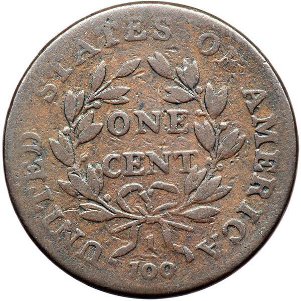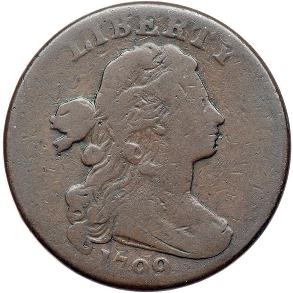 1799 S-189 R2 VG8. Very attractive glossy medium chocolate brown. Smooth surfaces that are void of any hint of corrosion or verdigris. Only trivial contact marks. A small nick on the base of the numerator is the best identifying mark, and it is barely visible. MDS. The date and LIBERTY were both properly struck up, which is often not the case for this variety, and the dull lump under E in ONE is present. The bottom edge of the date is fading into the rim below, but the remainder is strong and the legends are clear. A nicely balanced, very attractive example for the grade.