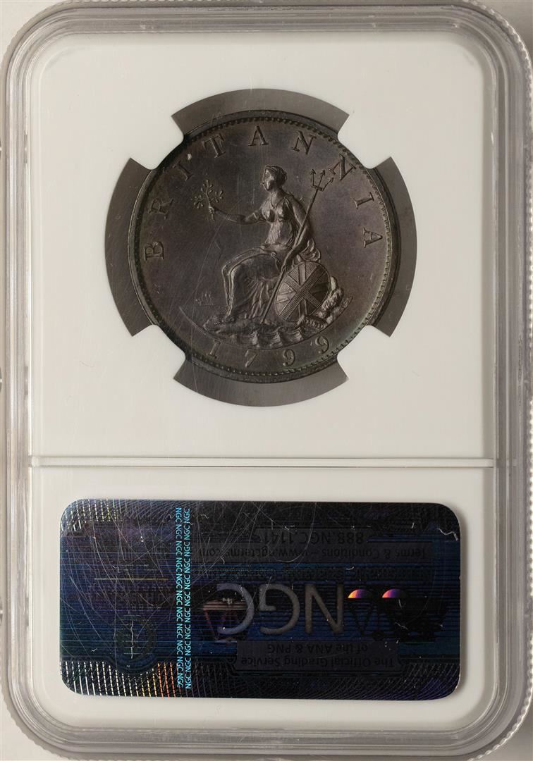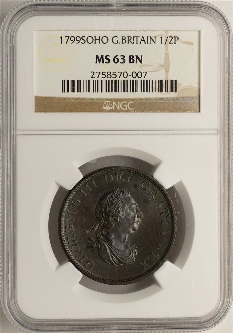 One 1799 SOHO Great Britain Half Penny Coin NGC MS63BN. NGC Certified.