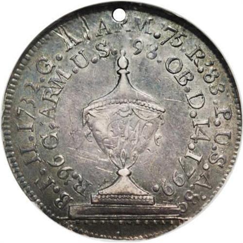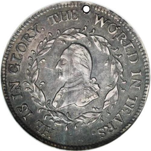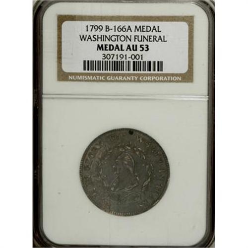 <B>1799 Washington Funeral Urn Medal AU53 NGC.</B></I> Baker-166A. Dies 3-B. Silver. Holed as issued. These pieces were struck for George Washington's civic funeral procession, held in Boston on February 22. Rich dove-gray and steel-blue toning dominates, although the lustrous borders are caramel-gold. Minor rim dings are noted between 3:30 and 4 o'clock, and the reverse has old, faded scratches at 11 o'clock and on the field near the urn.<BR><BR><b>Shipping:</b> Coins & Currency (<a target="_blank" href="http://www.heritageauctions.com/common/shipping.php">view shipping information</a>)
