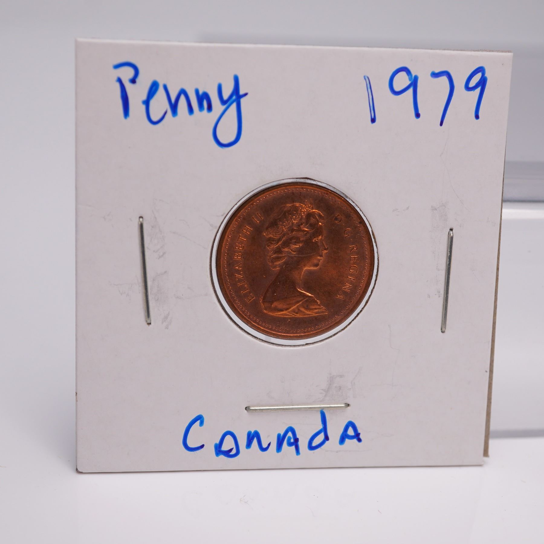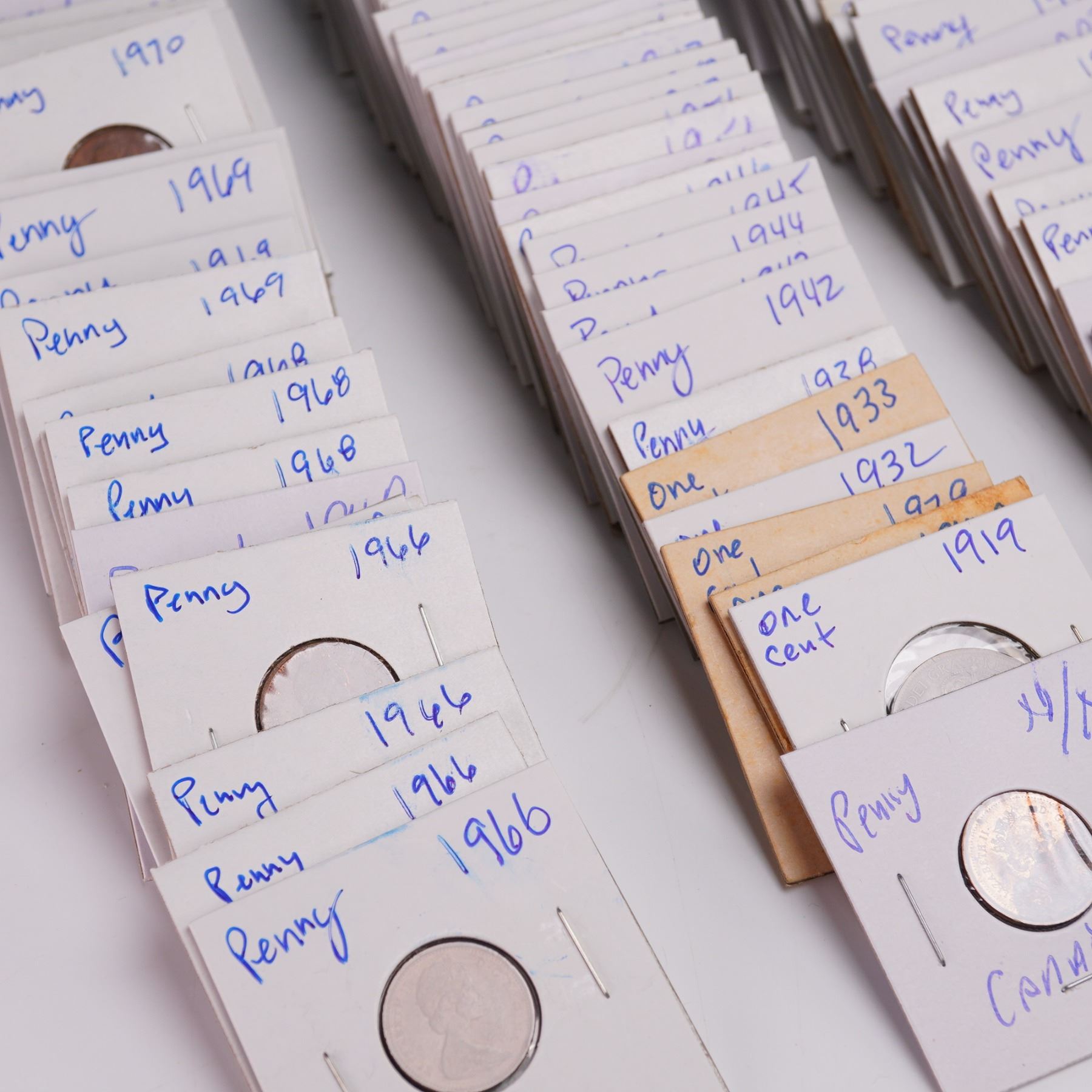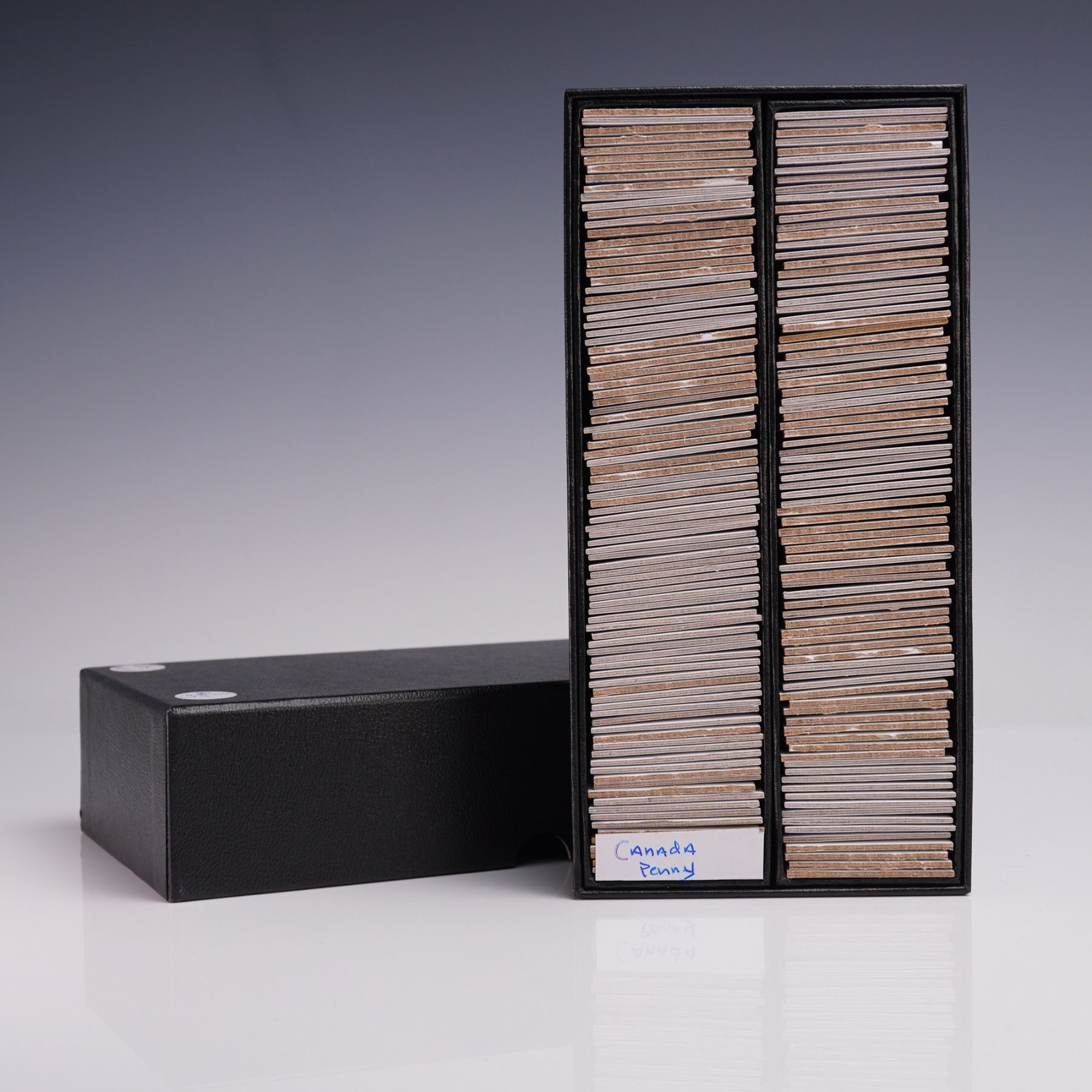 This collection comprises 179 Canadian one cent coins dated from 1919 through 2008. Each coin is individually housed in a protective holder and hand-labeled with its year of issue. The reverse designs vary by era: some feature the classic maple leaf twig motif accompanied by the inscriptions 1 CENT and CANADA, while others display a vine-encircled design with maple leaves surrounding the denomination and the word CANADA. The obverse side showcases the effigy of the reigning monarch at the time of minting - either King George V, King George VI, or Queen Elizabeth II. The coins are meticulously arranged in chronological order and stored in a black archival-quality storage box for preservation and easy reference. Coin protective holder: 2"L x 2"W. Black box: 9.75"L x 5"W x 2.25"H.