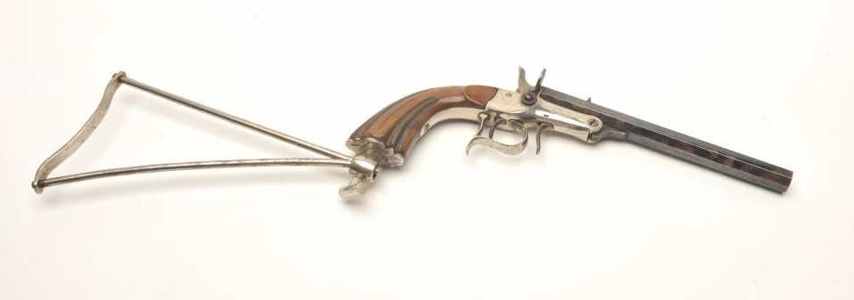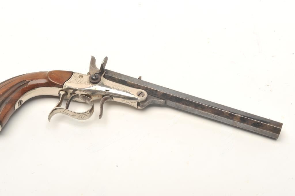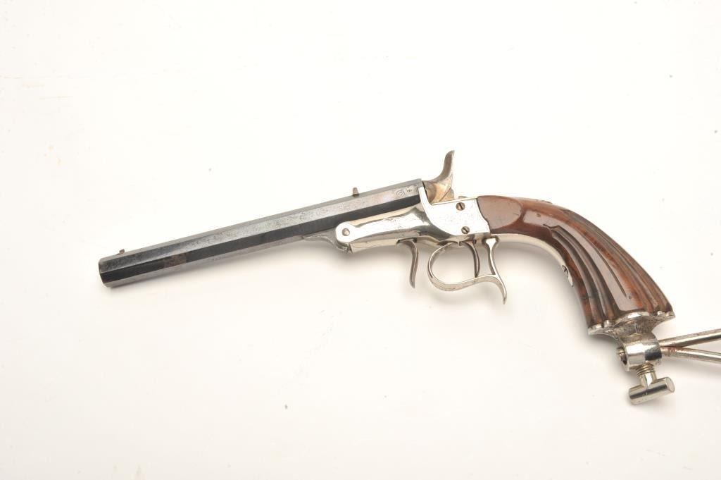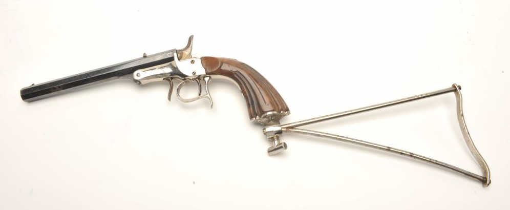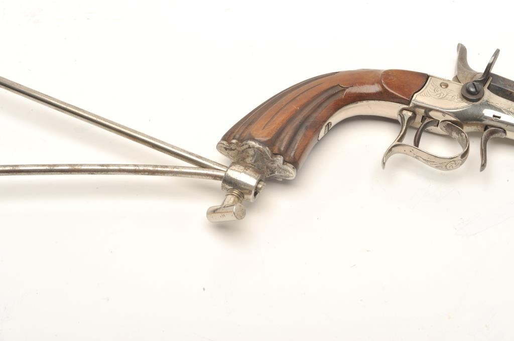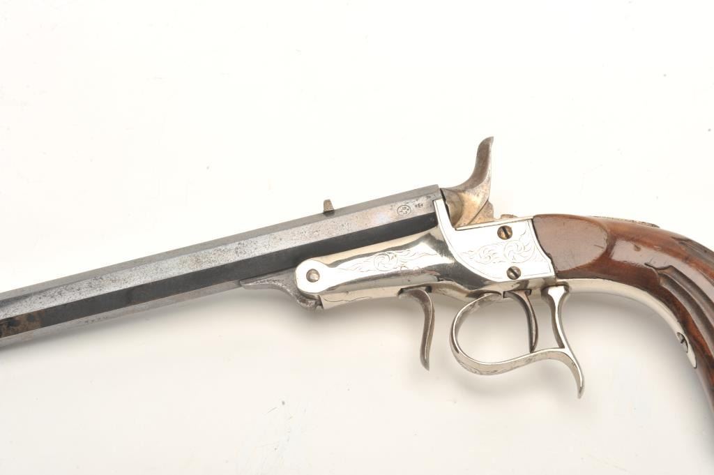 Belgium proofed Flobert style .22 caliber single shot target pistol with tip up barrel and removable shoulder stock. 80%-90% original blue on the barrel with some spotting and losses. Nickeled frame and Lot Title mounts about 90% with minor rust and erosion. Very good overall. (Antique) Est.: $650-1300