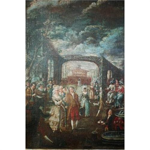 FANTASTIC EXTREMELY EARLY ITALIAN OLD MASTER!! Colorful and beautiful...whimsical and historical...charming and friendly--a terrific glimpse at a colonial era gala replete with masked and unmasked revelers in a joyous villa festivity! Lots of blues, cream, red, black and grey with a GORGEOUS ornate silver leaf frame which perfectly complements this sumptuous early original oil...professionally cleaned, relined and framed. Guaranteed to be as described...Thanks for looking, Chas.