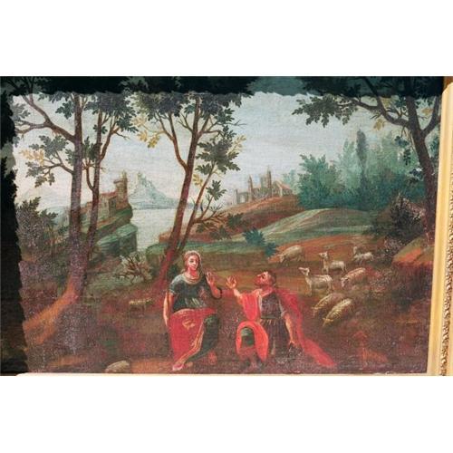 Great ancient old master original painting with romantic proposal theme in hilly landscape with castles and sheep!! Two central figures are engaged in an apparent marriage proposal with the maiden holding up her hand either to allow the suitor access to her finger or in a skeptical, guarded response...Only the painter knows and methinks he is long in the tomb! Relined in a deep dish, ornate gilt 19th. C. frame, this rare old painting is ready to hang and enjoy. Some small losses in paint speck sized occlusions to old, dry paint surface and apparent slight in paint on male suitor's red robe...Tight craquelure indicative of extremely early work and probably was professionally relined and reframed many years ago. Lining is tight and frame is in very good condition....Thanks for your interest, Chas.