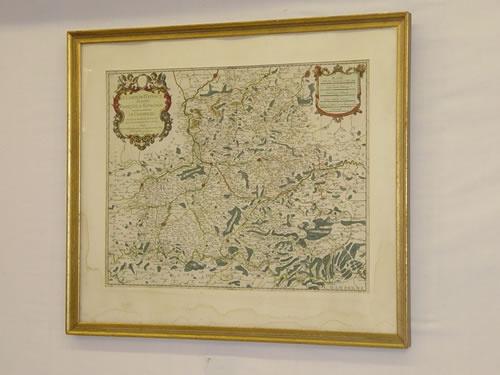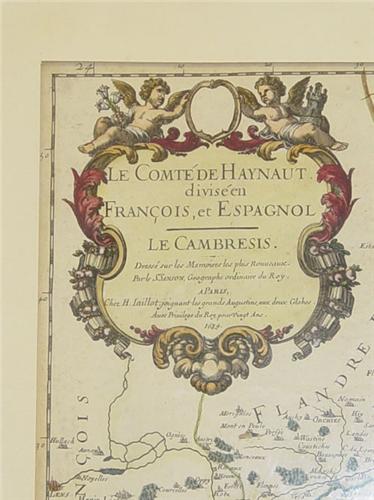17TH CENT. COLORED FRENCH MAP-"LE COMTE DE HAYNAUT- DIVISEEN - FRANCOIS ET ESPAGNOL LE CAMBRESIS ETC.", DATED 1689-PARLE S. SANSON/CHEZ H. JAILLOT-A PARIS ETC., FRAMED (16 3/4" X 22 1/4") - TONING, FOLDING CREASE, STAINS TO MATTING, IMPERFECTIONS