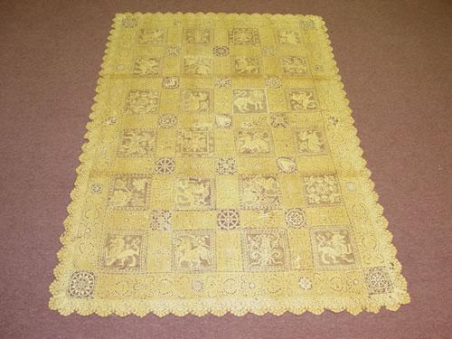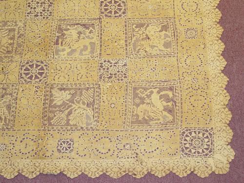 17TH CENT. ITALIAN CUTWORK & LACE LINEN ALTAR CLOTH W/ 24 DIFFERENT SQUARE HERALDIC PICTORIAL PANELS (43" X 64") - STAINING, REPAIRS, LOSSES, & IMPERFECTIONS