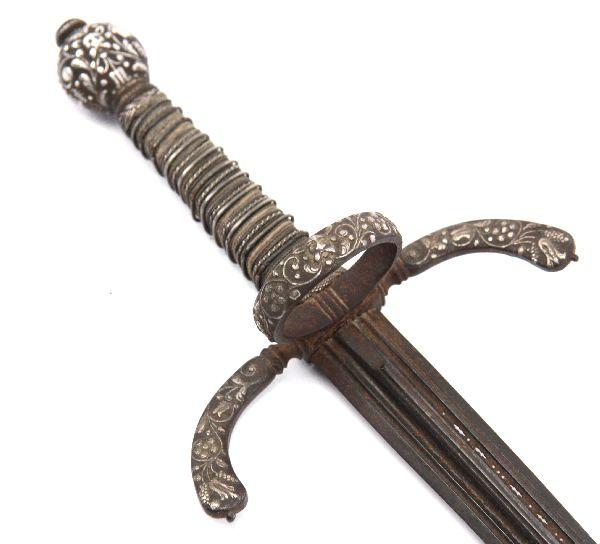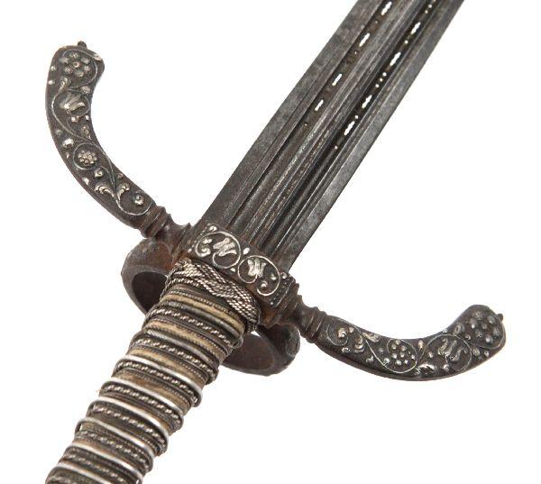 17th Century Spanish left handed (gauche) parrying dagger, used as a fighting accessory to a rapier sword. 10.5 inch thrusting blade with a quadrangular point. Two deep perforated fullers, as well as two secondary fullers on each side, with a raised midrib. Forward curving decorative silver inlaid iron quillon, with oval ring guard. Quadrangle wire wrapped grip, with braided silver wire ferrules, tapering to a round iron pommel, with raised decorative sterling patterns. Dark smooth patina on blade, quillon, and pommel. Minor chip to blade tip. Grip in very good condition, with minor fraying to wire piping. Overall very good condition.