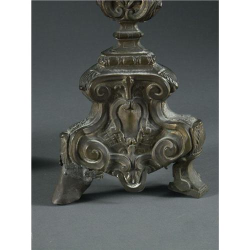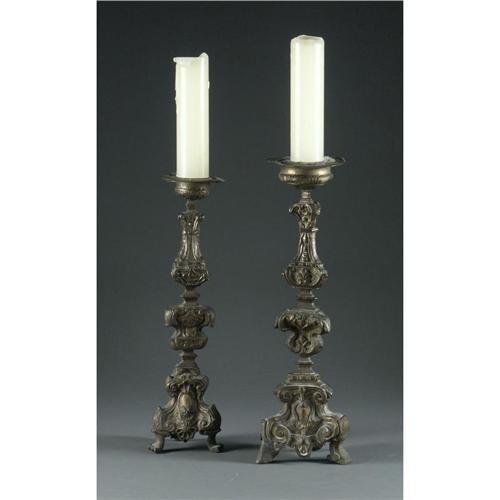 METALWARE: A pair of Spanish 17th or 18th century molded metal pricket candlesticks, patinated, wear commensurate with age, re-fabricated foot on one of the pair, 17''.