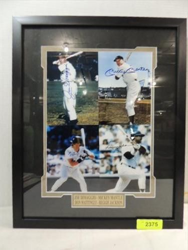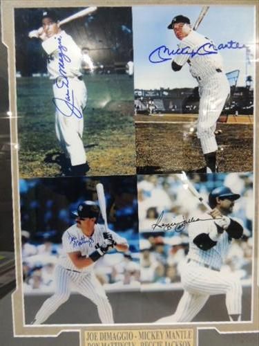 17X22 FRAMED 4 BASEBALL PHOTO 4 AUTOGRAPHS: MANTLE, JACKSON, MATTINGLY AND DEMAGGIO. INCLUDES COA FROM MFP II. AS SHOWN. VIEW PICTURE FOR DETAIL. PLEASE BE ADVISED, AND INFORMED REGARDING SIGNATURES OR AUTOGRAPHS THAT WE SELL AT AUCTION: WE ARE NOT AUTHENTICATORS, AND WE DO NOT AUTHENTICATE, OR VALIDATE ANY AUTOGRAPHS OR SIGNATURES THAT WE OFFER AT AUCTION. SOME AUTOGRAPHS OR SIGNATURES MAY COME WITH AN AUTHENTICATION FROM ANY ONE OF LITERALLY HUNDREDS OF AUTHENTICATORS ACROSS THE COUNTRY, AND AROUND THE WORLD. WE DO NOT ENDORSE ANY AUTHENTICATOR, NOR DO WE GUARANTEE THAT ANY AUTOGRAPH OR SIGNATURE IS AUTHENTIC, OR THAT IT WILL PASS AUTHENTICATION BY ANY AUTHENTICATOR. ALL AUTOGRAPHS OR SIGNATURES ARE SOLD