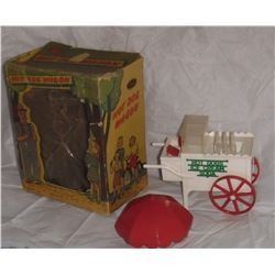 A rare Ideal boxed 1950s Hot Dog Wagon Ice cream Soda vendor umbrella cart soda playset toy, 60 years plus old in near mint or mint condition Made in the U.S.A. 1950's or older Hot Dog Wagon or Ice cream vendor exquisite cart, with a red parasol you can top with it to protect the cart hot dog- ice cream- soda play set toy, oh with rare as is box, this plastic cart is beautiful with gorgeous red 2 big wheels that move, with green on one side letters "HOT DOGS ICE CREAM SODA" which is added on plastic sign too in excellent superb condition as NOT At All used yet and clean white, all old hard plastic; to displaying well in your museum or store or antique cabinet, for your collection or start one now this collectible hot dog cart antique / vintage toy !!! Cart toy can also be useful to hide your jewels in it or other teeasures ?