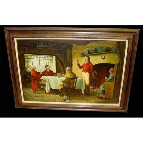 17th century English interior scene oil painting form print, colorfully depicting gentleman celebrating a toast, signed B. g. Williams lower left and mounted in a giltwood frame. ****NOTE: Email for larger images.