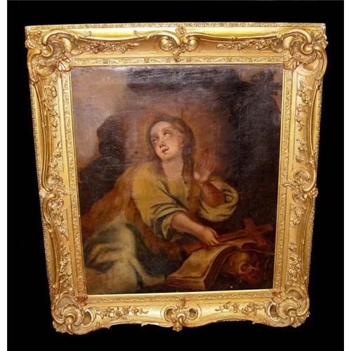 Fine 17th Century German School, Oil on Canvas, "Mary Magdalene" The painting depicts the penitent Mary Magdalene holding a cross, beside a skull and weeping. The life of the historical Mary Magdalene is the subject of ongoing debate, while the less-obscure development of the "Penitent Magdalene", as the most beloved medieval female saint after Mary, both as an exemplar for the theological discussion of penitence and a social parable for the position and custody of women, provides matter for the social historian and the history of ideas. This work is housed in its original ornately carved gilt wood frame.