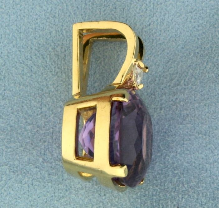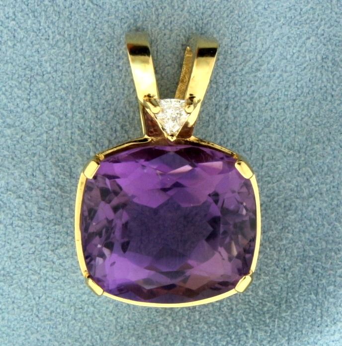 In 14k yellow gold, containing a 17ct high quality cushion cut natural amethyst gemstone, with beautiful purple color and excellent clarity. Also contains a 1/4ct high quality trillion cut diamond of VS clarity/H color. 1" long. 10.9g.