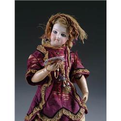17” ALL ORIGINAL FRENCH FASHION. Possibly by Jumeau, this fashion has a French Fashion gusseted kid body with jointed wooden arms. Large almond eye cut with tri-colored blue-gray paperweight eyes enhance the pale bisque of this doll. Original clothing shows severe melting to the front, but rear is well intact. CONDITION: Kid body shows some wear with repairs to kid gussets. Bisque head has a small amount of peppering throughout. Small chips at earring holes. JL 1-2280