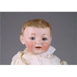 17” JDK 211 BABY. An alluring baby with blue glass sleep eyes, original skin wig and is on a five-piece Kestner baby body and is wearing original clothing. CONDITION: Skin wig has not been removed from head but head has been inspected and it appears to be free of damage. Minor wear to finger tips on baby’s right hand. JL 1-2538