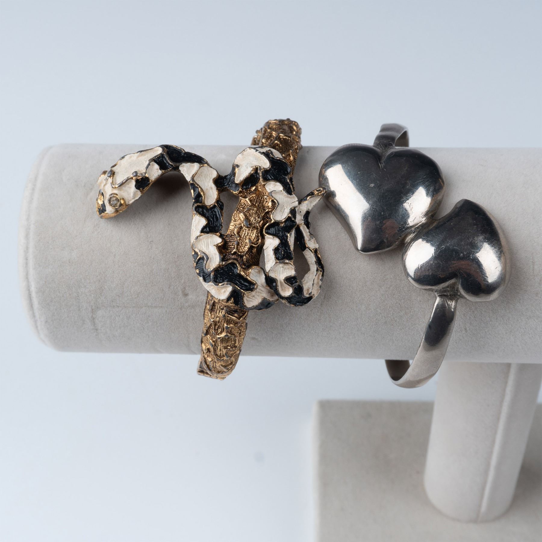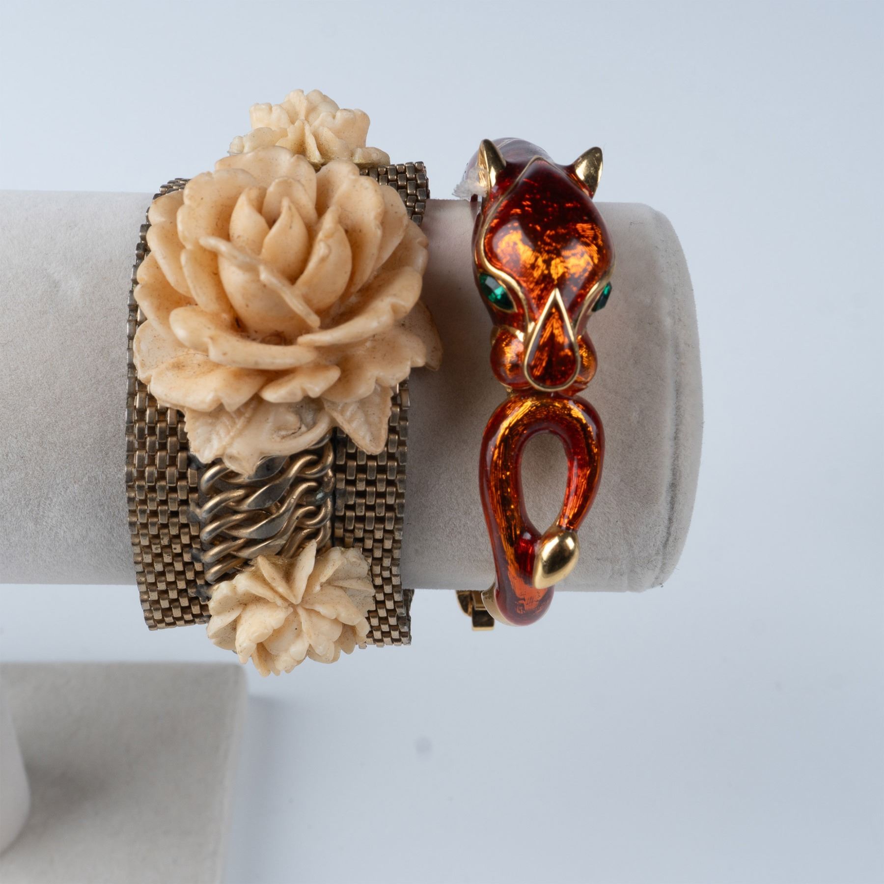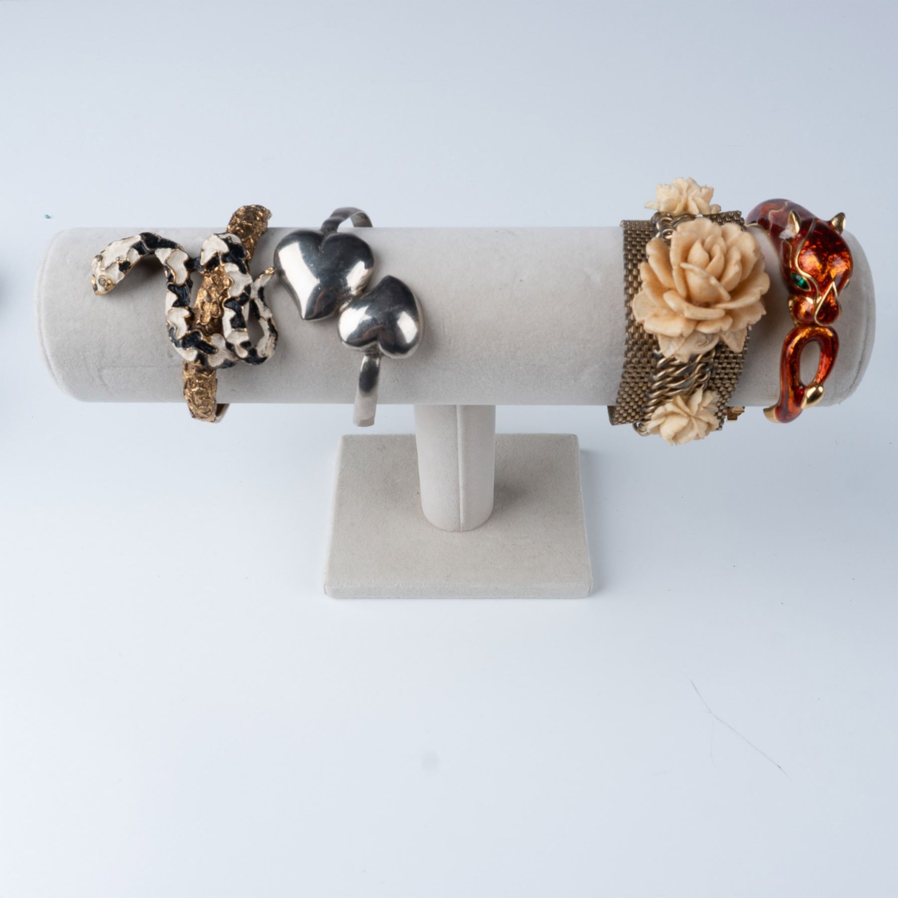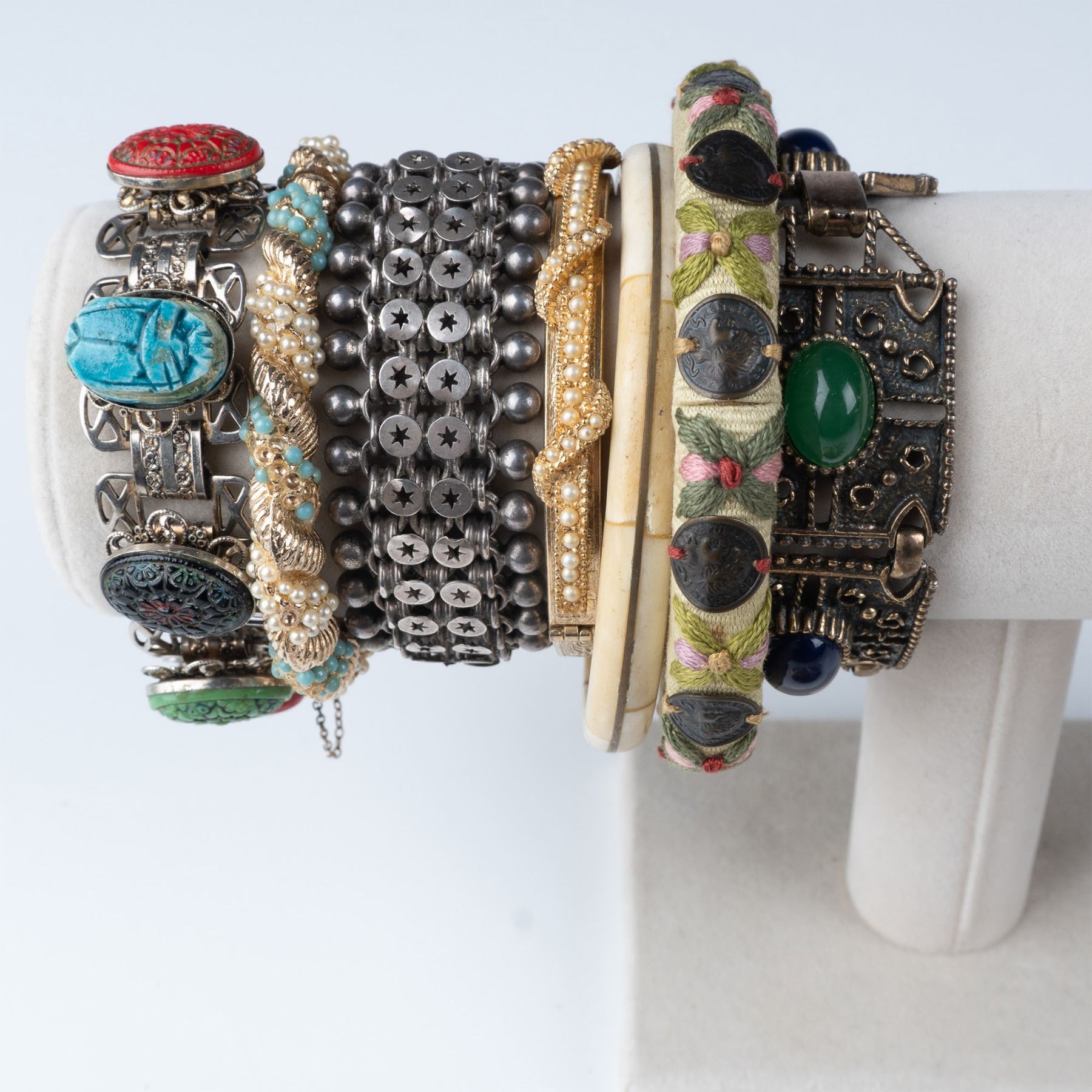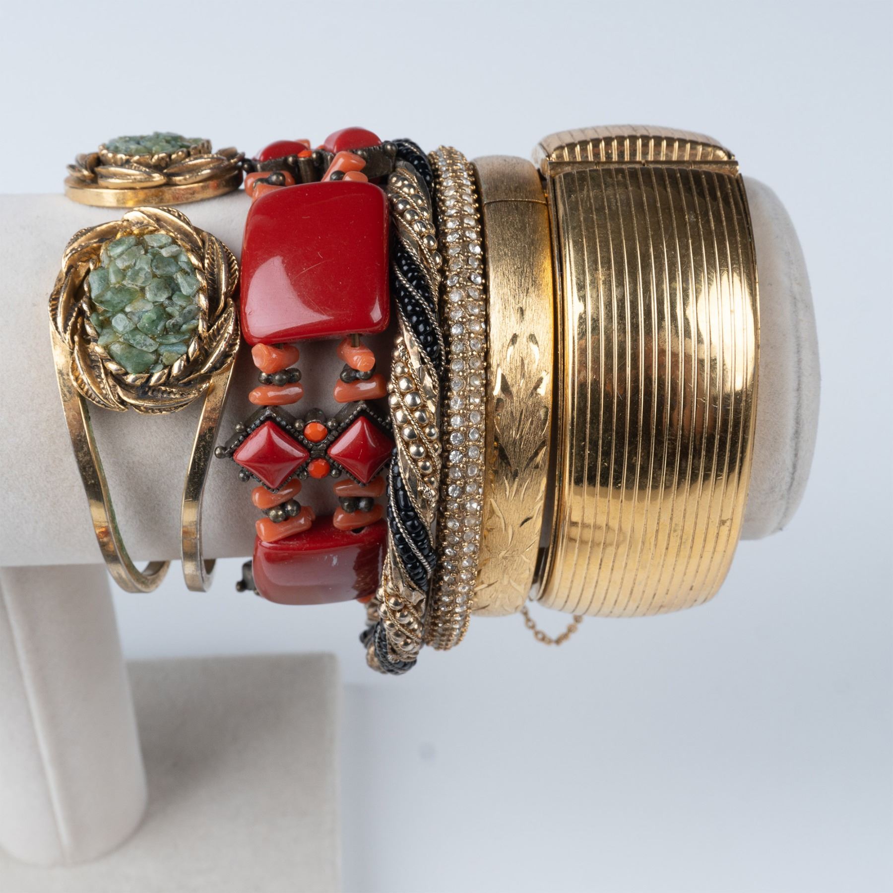 This lot features a collection of 17 vintage bracelets and bangles, each showcasing distinct designs and materials. The assortment includes various metal bracelets, including gold-tone, silver-tone, and other unique finishes. Highlights include a bold enamel snake motif bangle, intricately detailed beaded bracelets, a floral mesh bracelet, and colorful beaded pieces with glass stones. Additionally, the collection features several smooth bangles, some with subtle floral details and others with a simple, elegant gold-tone finish. These pieces reflect the wide range of vintage jewelry styles, perfect for collectors and those seeking unique accessories. Each bracelet measures approximately: 3" dia.