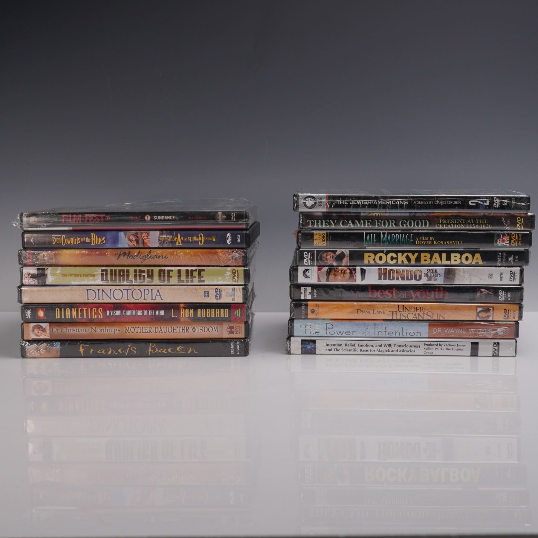 A collection of 17 movies and documentaries including the Jewish Americans, They Came For Good, Late Marriage, Rocky Balboa, Hondo, The Best Of Youth, Under The Tuscan Sun, The Power of Intention, Intention, Belief, Emotion and Will, Francis Bacon, Dianetics, Mother Daughter Wisdom, Dinotopia, Quality of Life, Modigliani, Even Cowgirls Get The Blues, and Film fest Vol. 1 Issue 1. All movies are included in its original packaging.