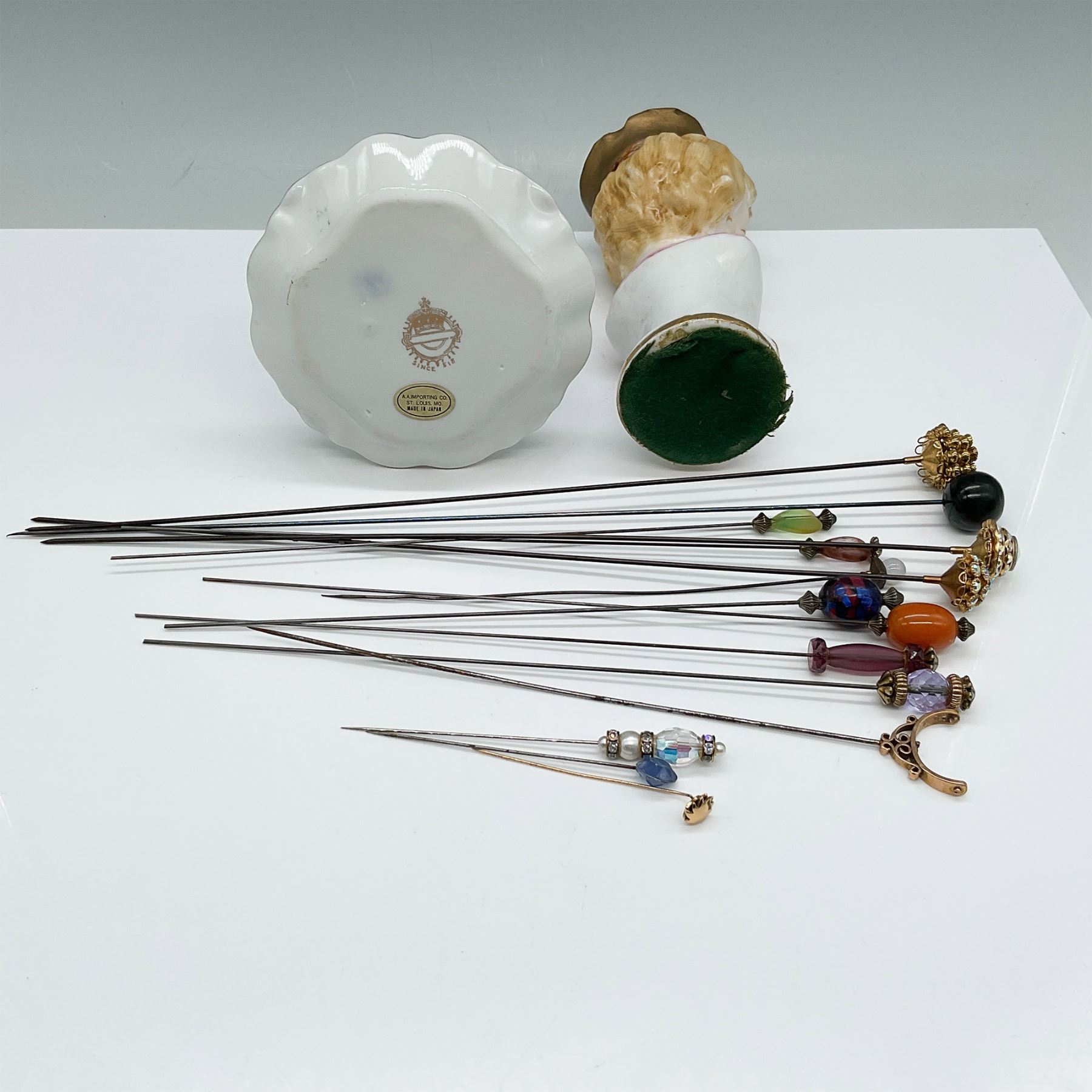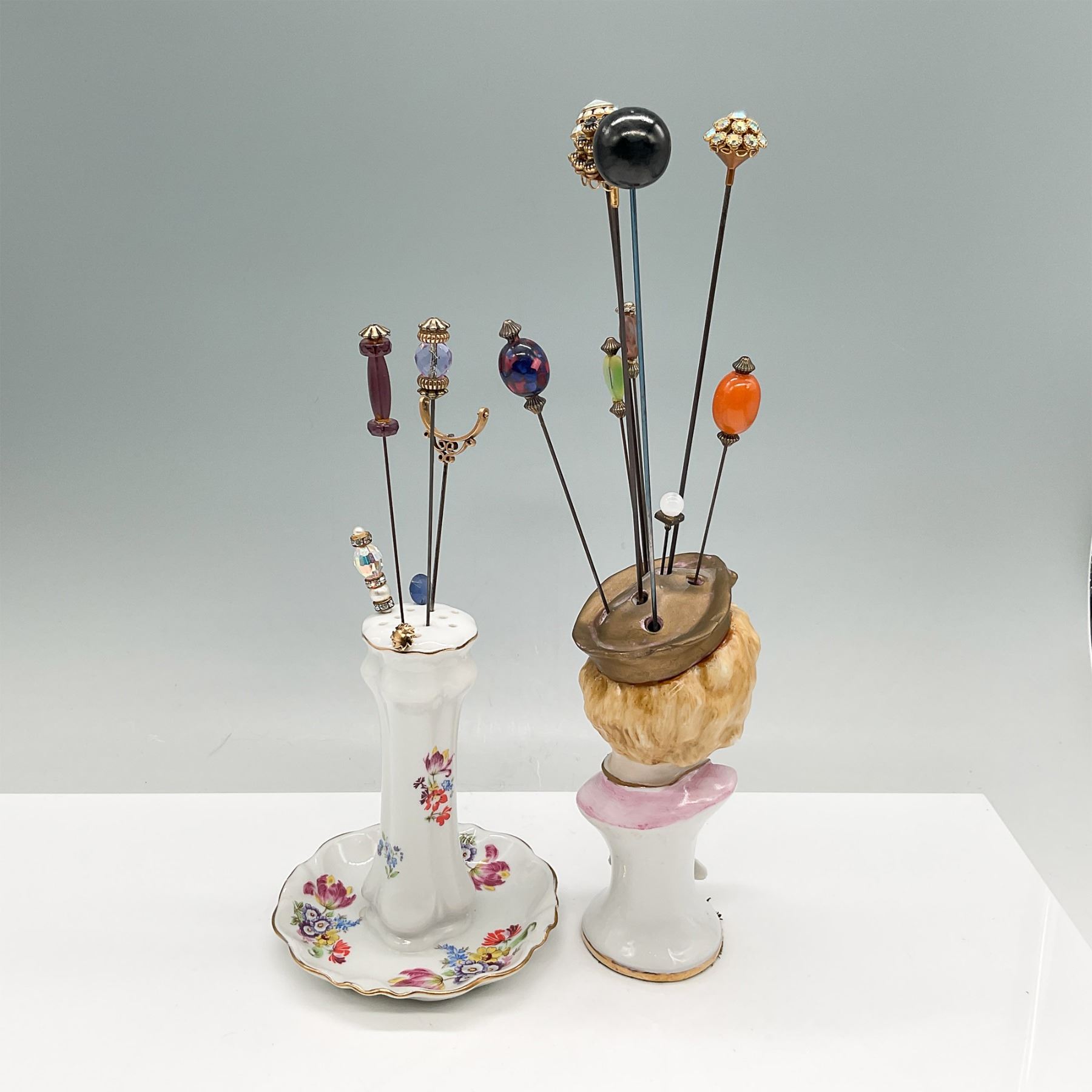 A pair of vintage Japanese porcelain hatpin holders accompanied by a collection of assorted hatpins. The first holder is a finely detailed bust of a young girl wearing a tilted hat (6"H), adorned with hand-painted features and floral accents. The second holder is a floral-adorned pedestal (5"H) design with a matching underplate, decorated with colorful flowers and gold trim. Both pieces are marked Japan on the underside, indicating their origin. Included are various vintage hatpins, some featuring ornate gold-tone filigree heads, colorful glass beads, and decorative elements.