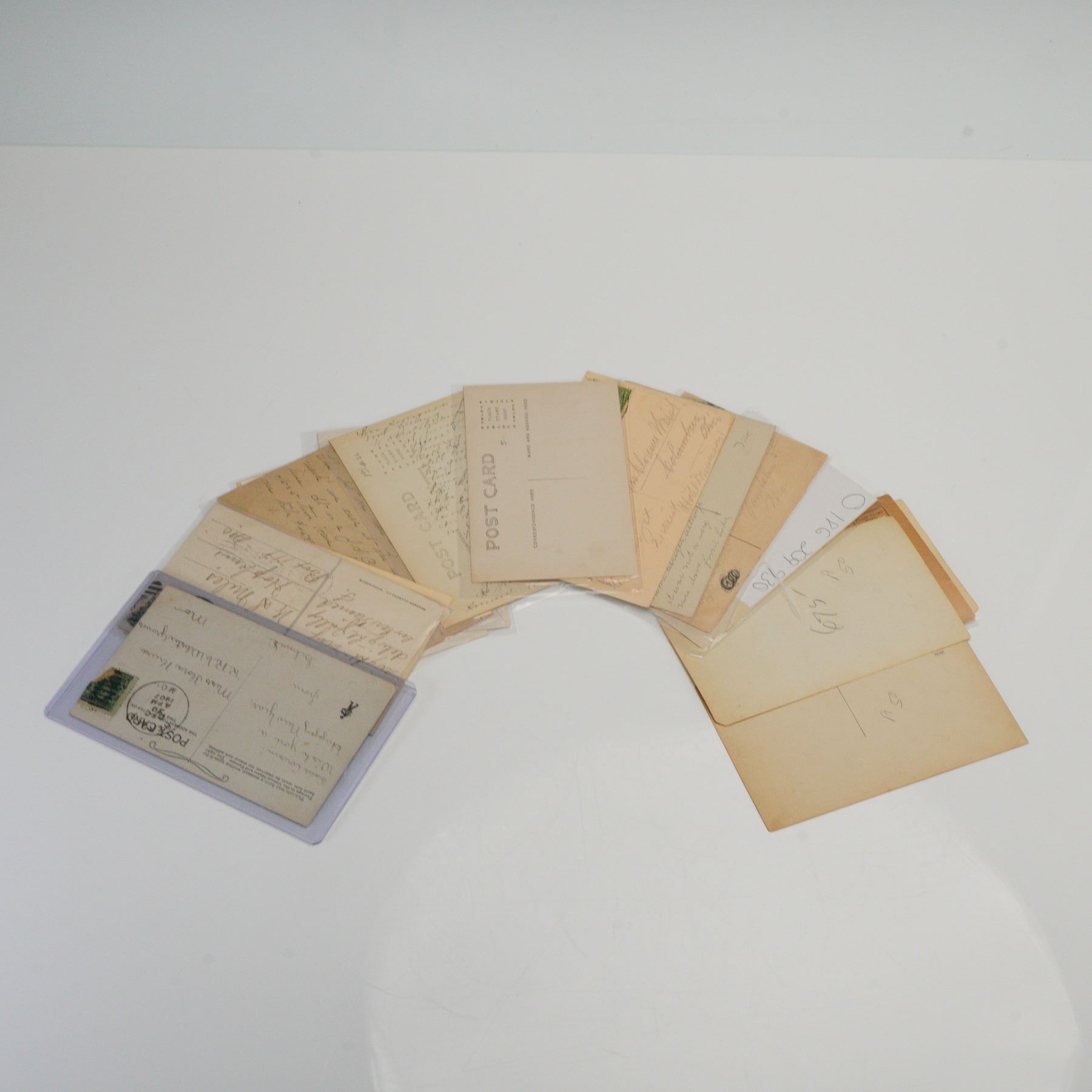 A collection comprising a mix of photo and printed examples, featuring rural landscapes, architecture, and industrial scenes. Includes black and white imagery capturing period documentation of small-town life and agricultural industry. Several cards bearing postmarks and handwritten messages. Some cards are preserved in plastic sleeves.