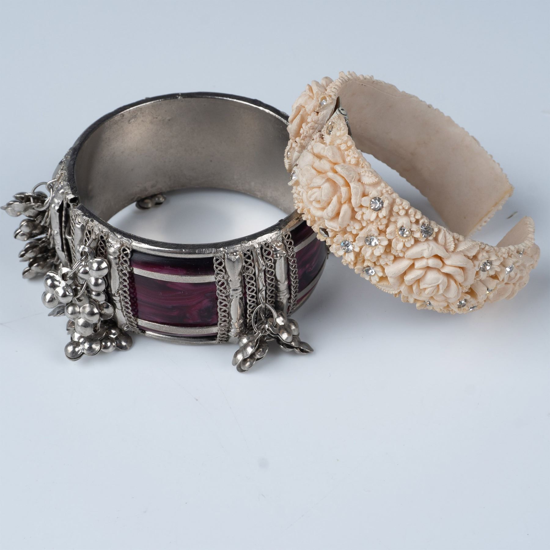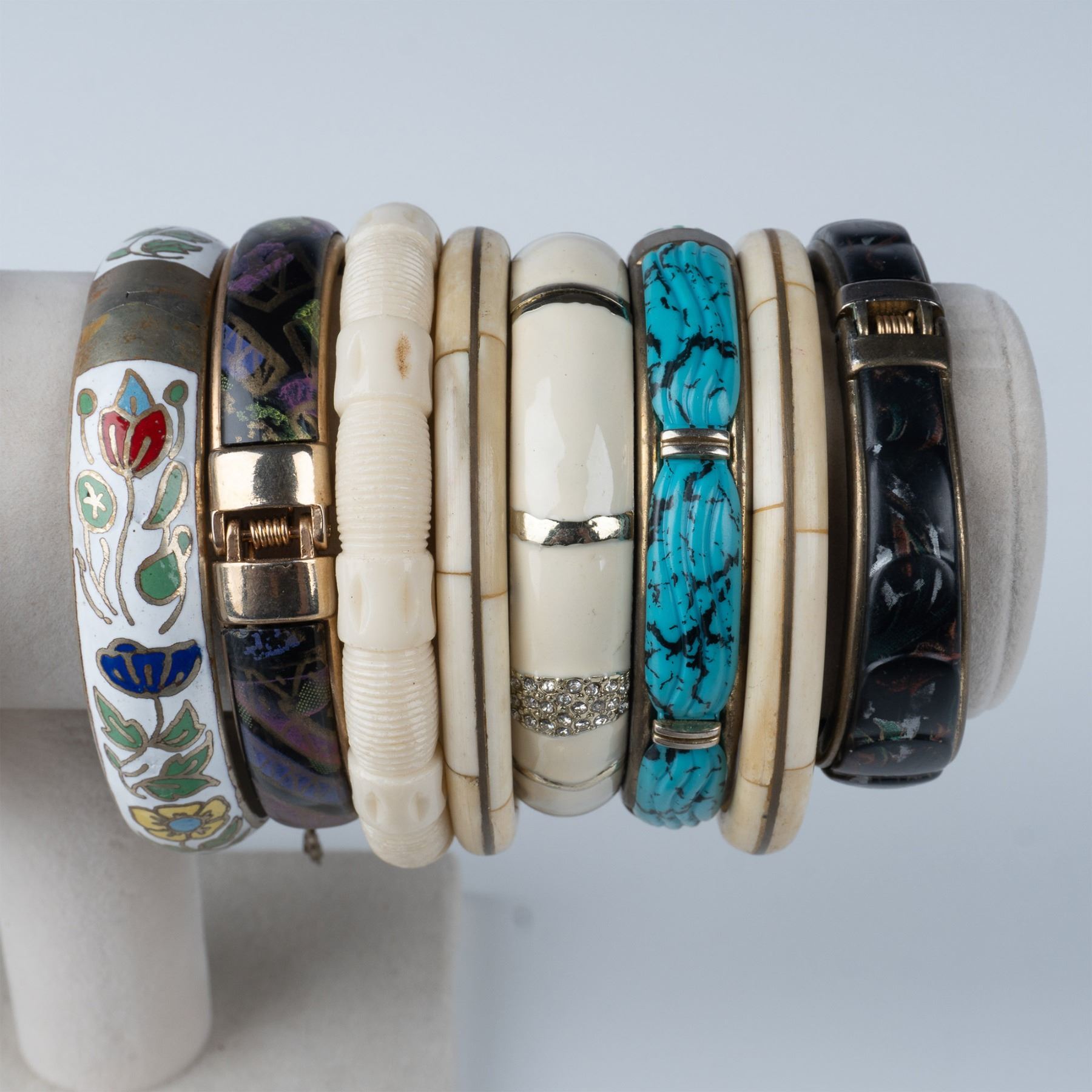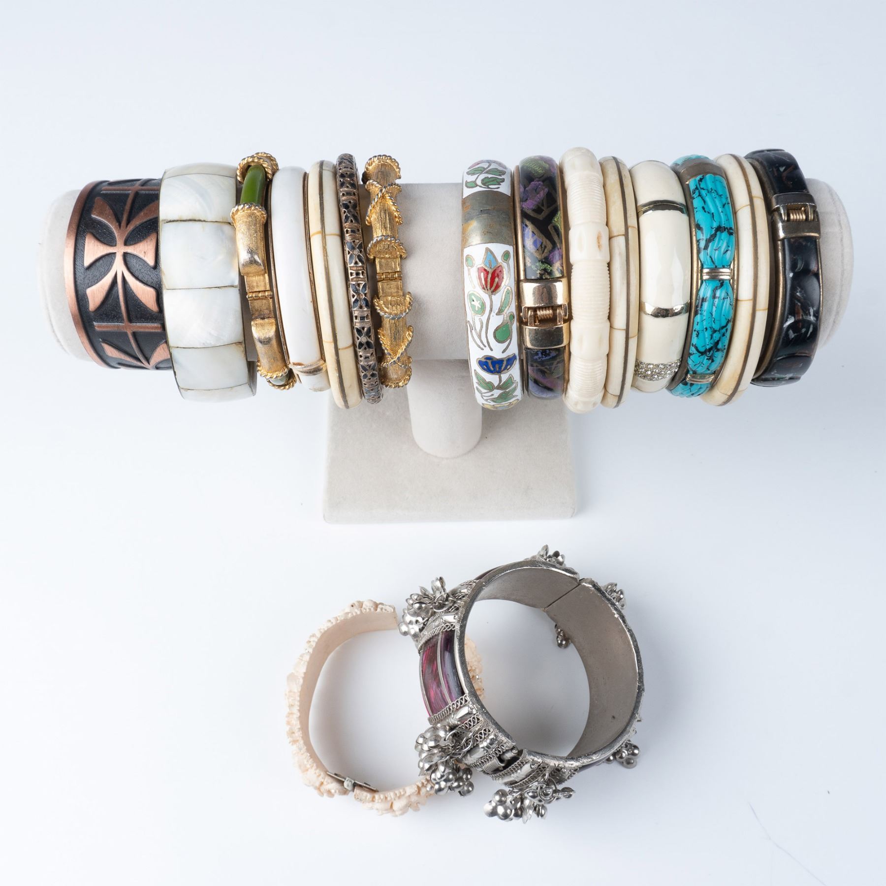A collection of 17 vintage bangle bracelets, each featuring unique designs and materials. The assortment includes a variety of styles such as enamel, carved bone, metal, and decorative pieces with rhinestones, and green and turquoise accents. The bracelets feature intricate details, including floral motifs and textured patterns. Notable pieces include a detailed silver-tone bracelet adorned with gemstones and a carved bone bracelet with a floral design. Each bracelet offers a unique appeal, showcasing the craftsmanship of different eras. This lot includes a mix of modern and vintage styles, some in excellent condition, others showing minor wear consistent with age. Each bracelet measures approximately: 3" dia.