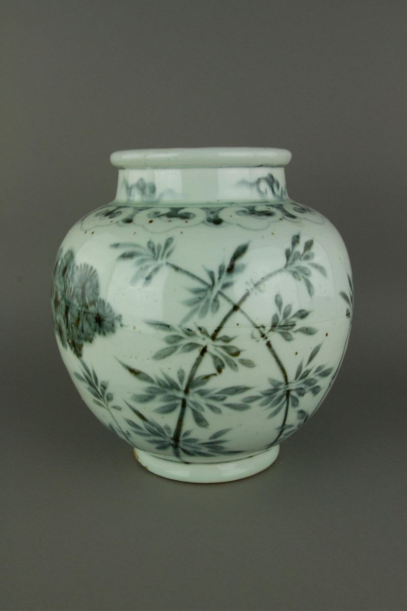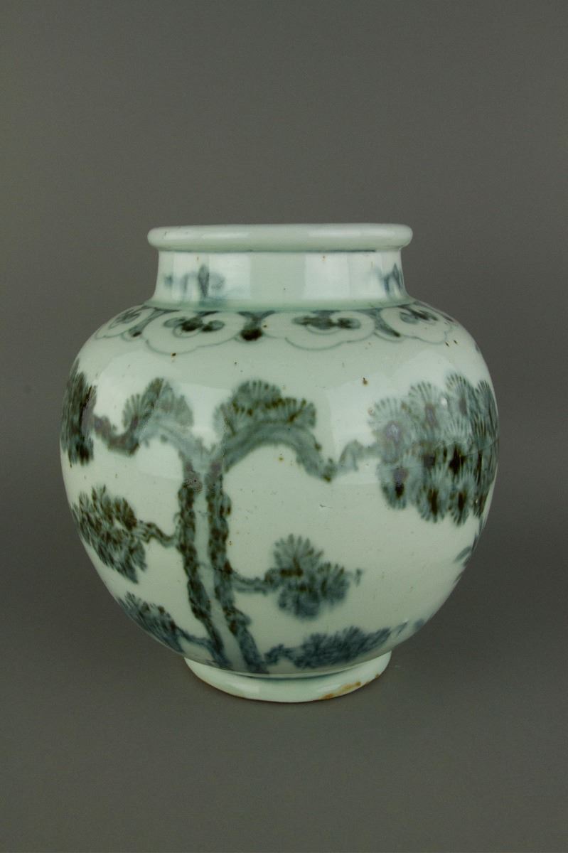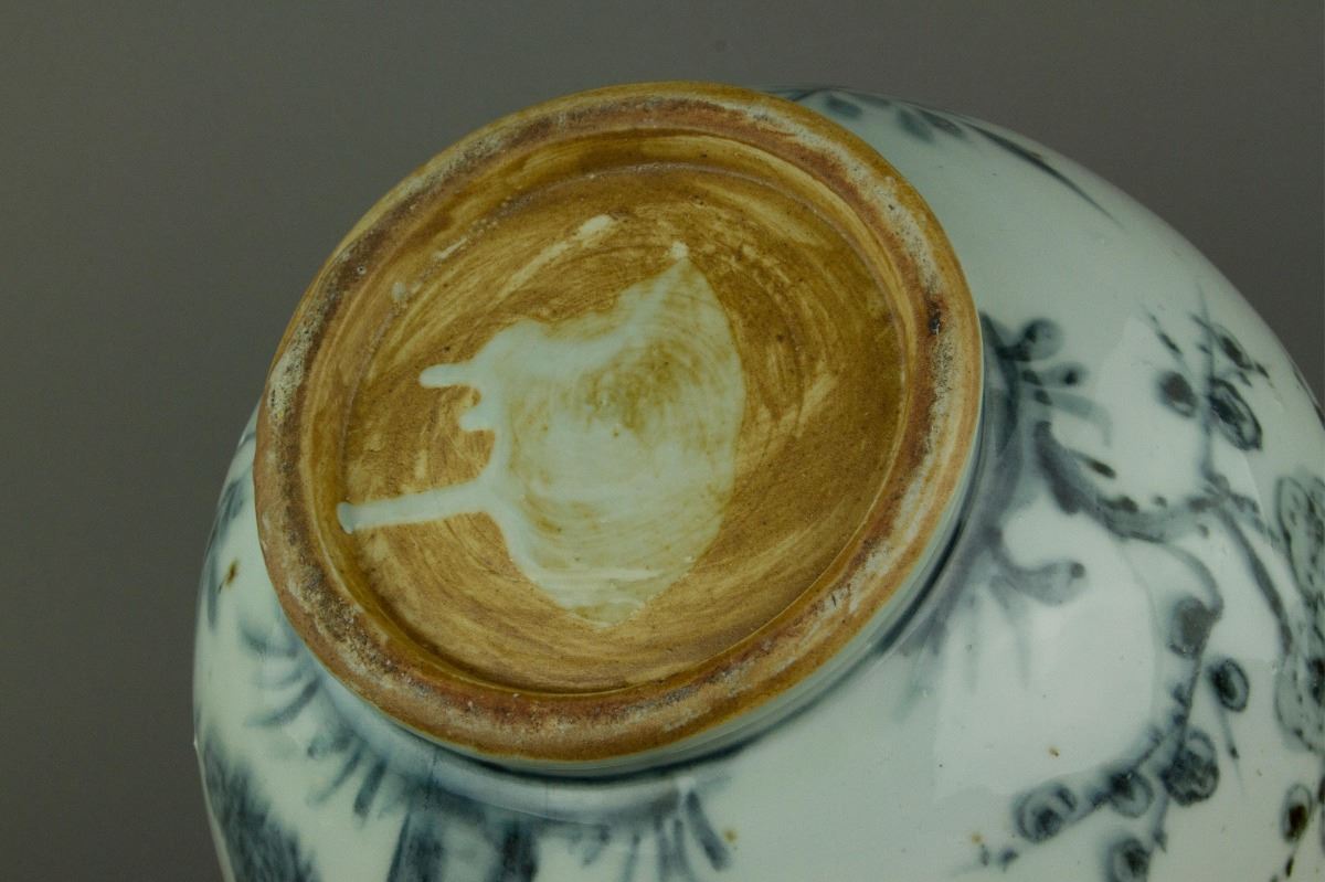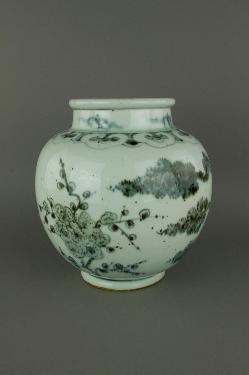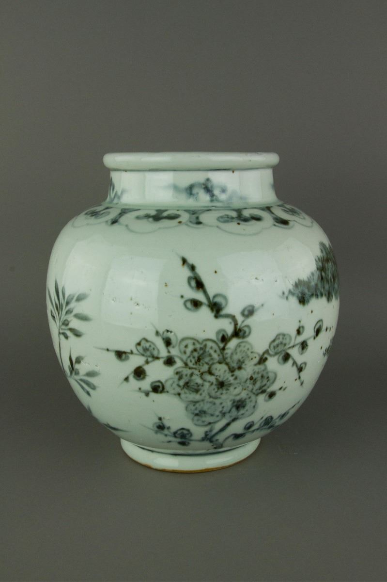 Chinese blue and white porcelain jar; 17th to 18th century; of globular body with short neck and lipped rim; painted with three friends of winter (pine, bamboo, and plum); H: 27 cm, D: 24 cm, 3907 grams