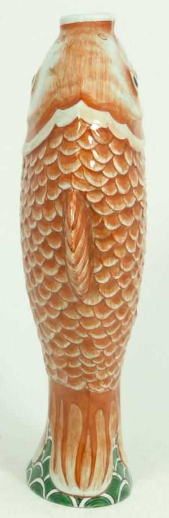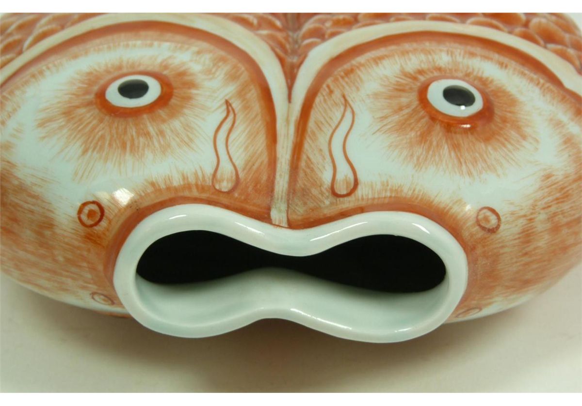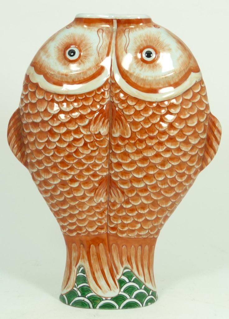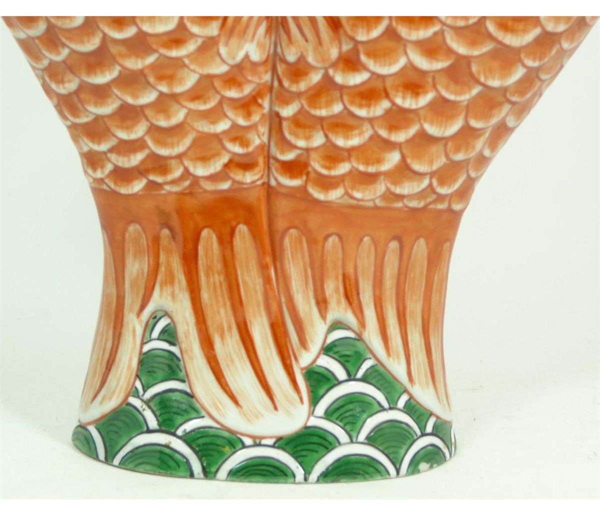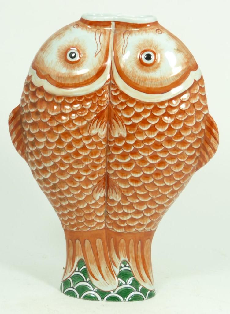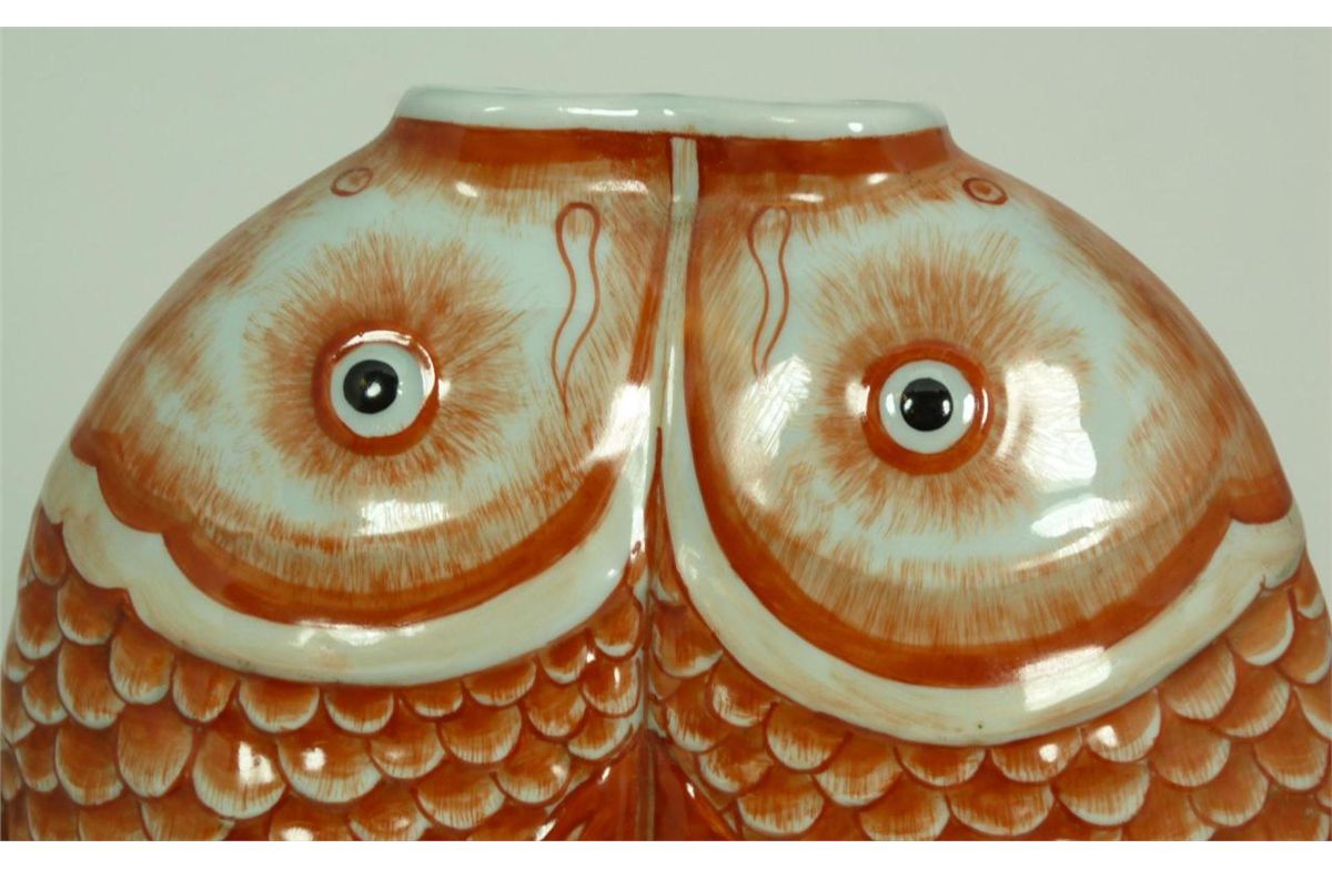 Antique Chinese hand painted iron red double carp vase. Circa Kangxi period (1662-1722). Measures 9 3/4" height x 7 3/8" width (24.7cm x 18.7cm). Total weight of 1037 grams.