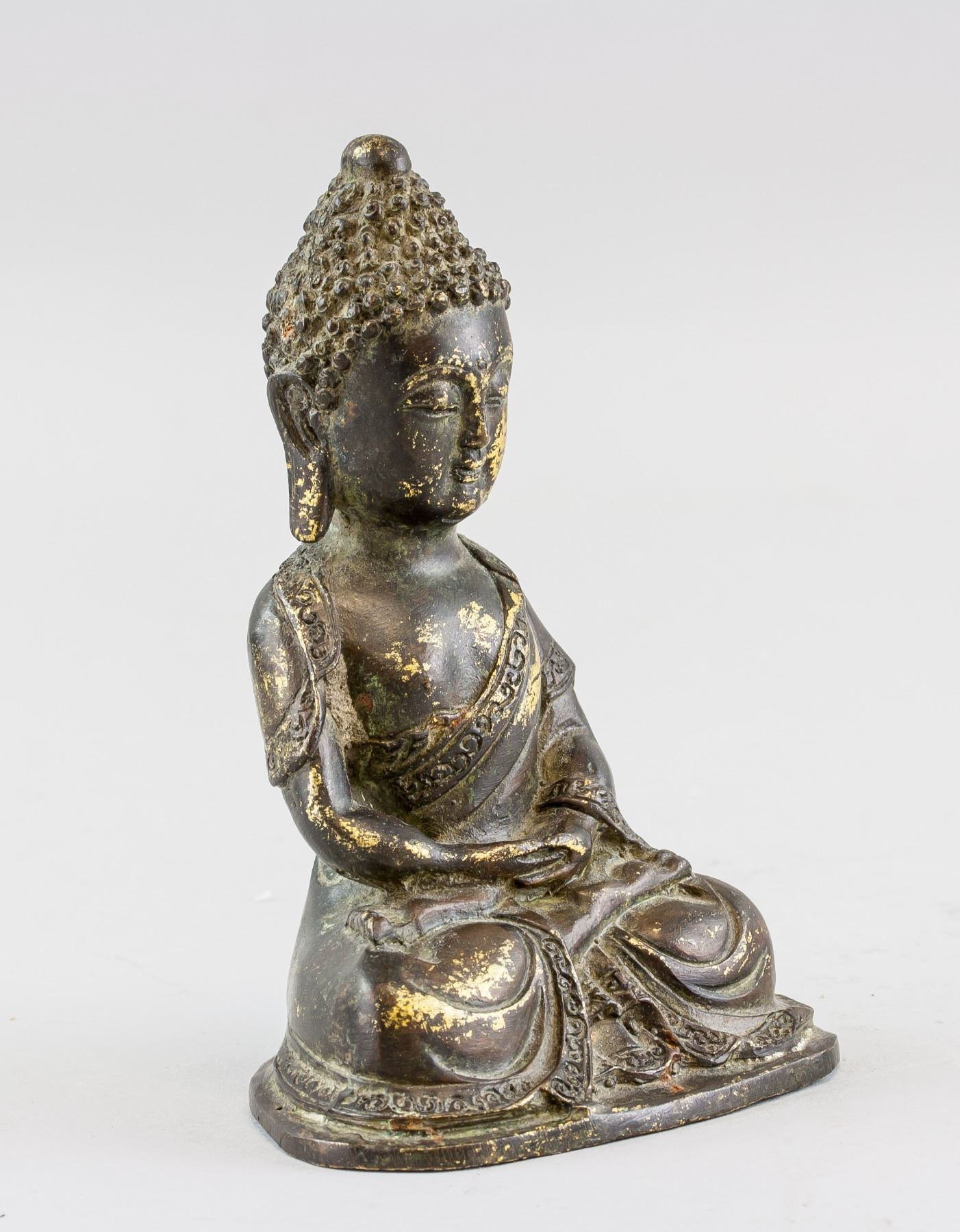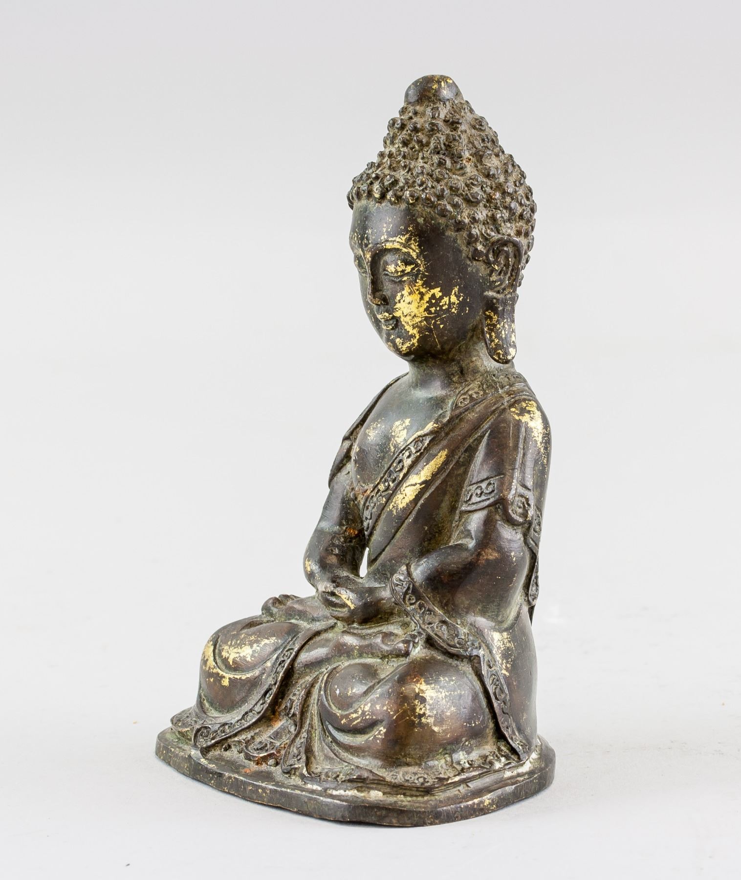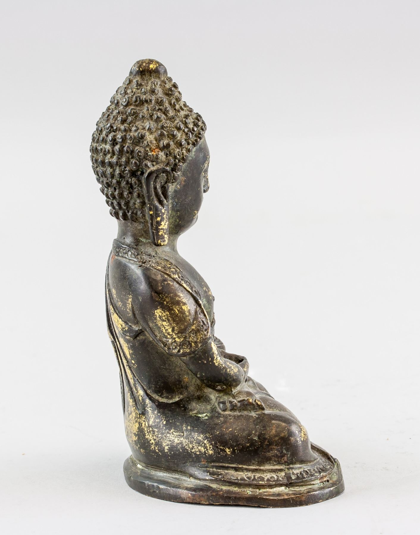 17th-18th century Chinese Qing dynasty bronze Buddha statue, featuring seated Shakyamuni Buddha on lotus pedal base, 11.5 cm x 8 cm, 300 grams