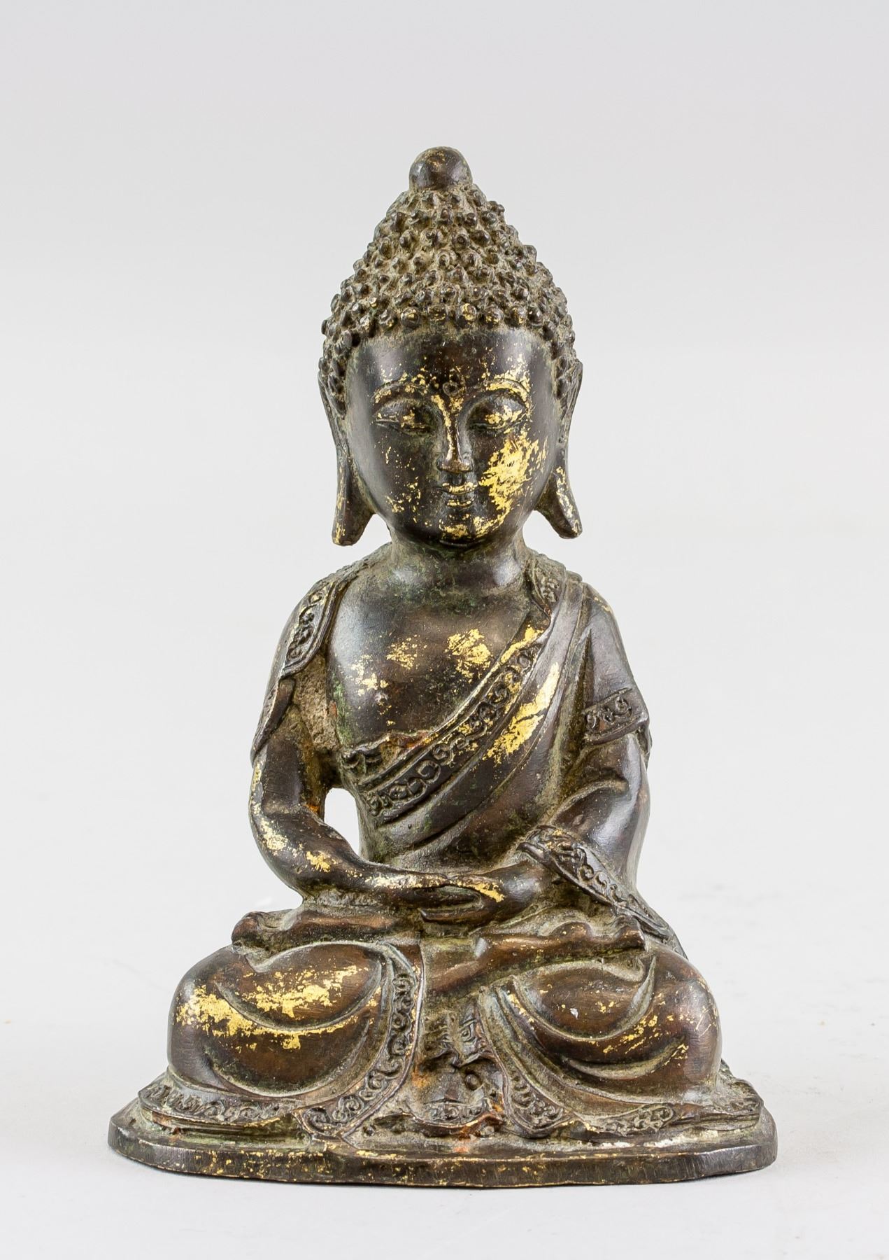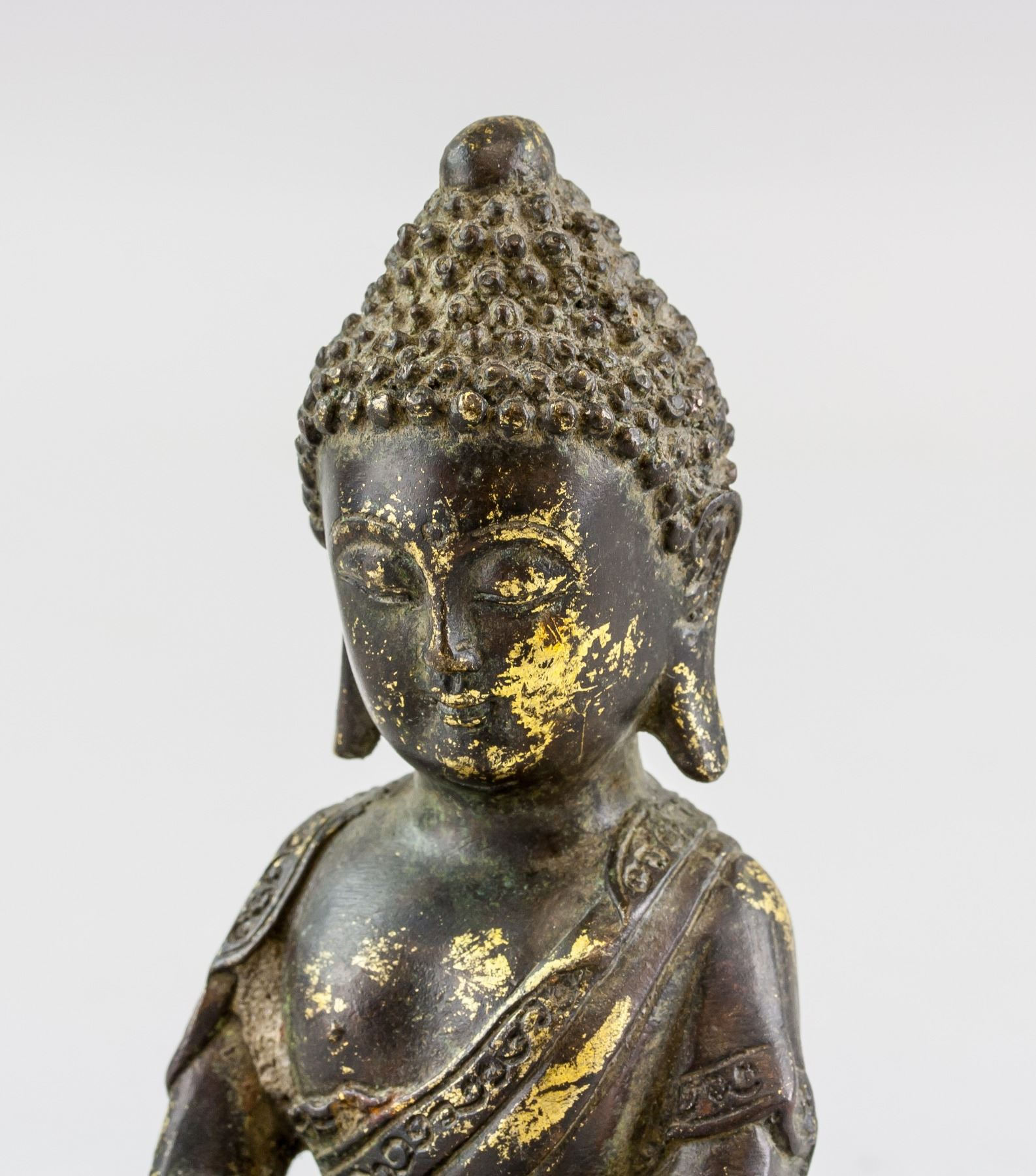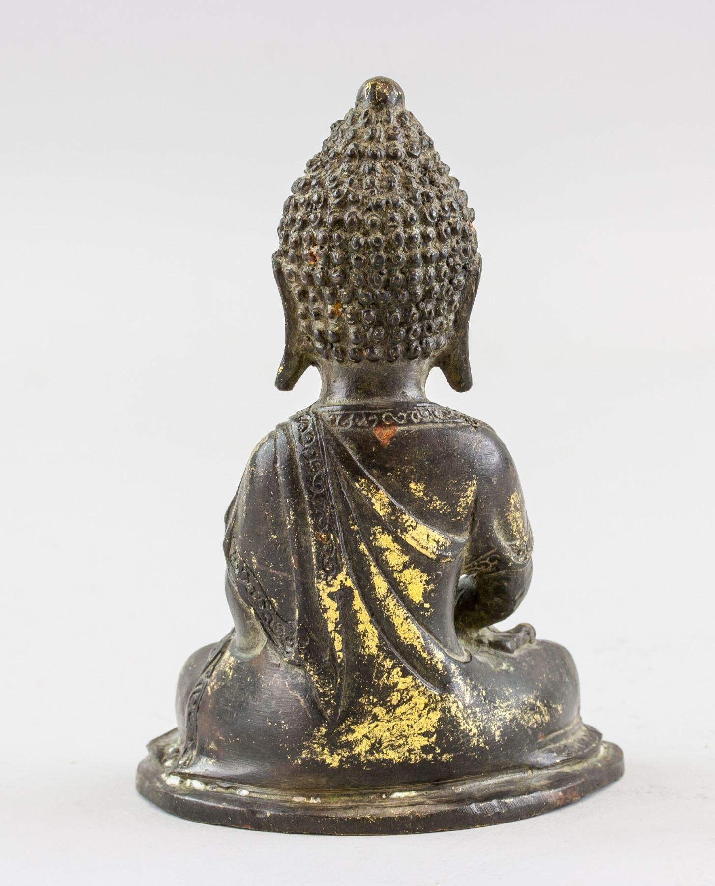 17th-18th century Chinese Qing dynasty bronze Buddha statue, featuring seated Shakyamuni Buddha on lotus pedal base, 11.5 cm x 8 cm, 300 grams