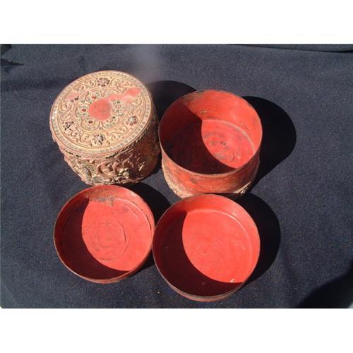 Exquisite and rare 17th.-18th. century Burmese lacquer container with relief gilded decorations and inlaid polychrome glass insets imitating the precious stones. The decorations are in shape of phoenix birds encircling a central floral panel. Several ornamental parts are missing due to the high relief of the applique on lacquer and the exposure of the glass insets to friction with handling over the centuries. The interior contains 3 cinnabar lacquer compartments. Diameter; 5.1" (13 cm.). Height: 4.5" (11.5 cm.). Estimated value: $7000.