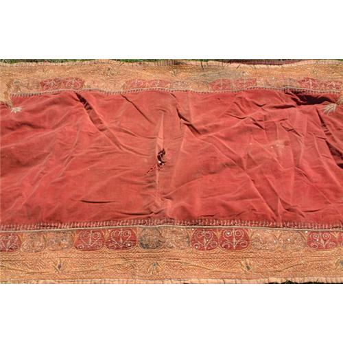 Extremely rare royal Moghul tapestry dating to 17th.-18th. century. It is hand woven and embroidered on red velvet with gold threads. The tapestry sufered some damage over the century: the central portion of the background velvet has a central rip and also marginal damage to the tapestry and the backing red textile backing. Nevertheless, the textile is having clear design and the damage is consistent with the considerable age of this textile. This textile probably originates from the palace of maharajah residing in Varanasi. Dimensions: 72" X 64" (183 cm. X 163 cm.). Estimated retail value: $10,000.