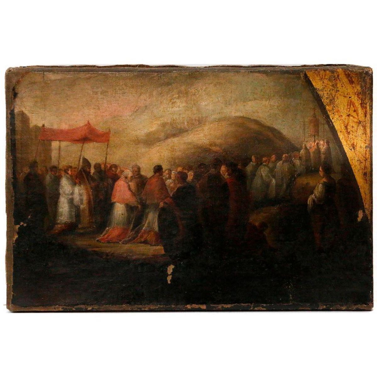Artist: Unsigned. Subject/Title: A religious procession. Date Created: 17th/18th century. Medium: Oil on canvas. Size Image: 11 1/2 inches high 16 1/2. Size Frame: Unframed. Condition: Some paint loss on edges and lower center.