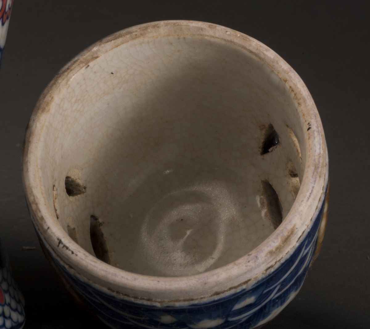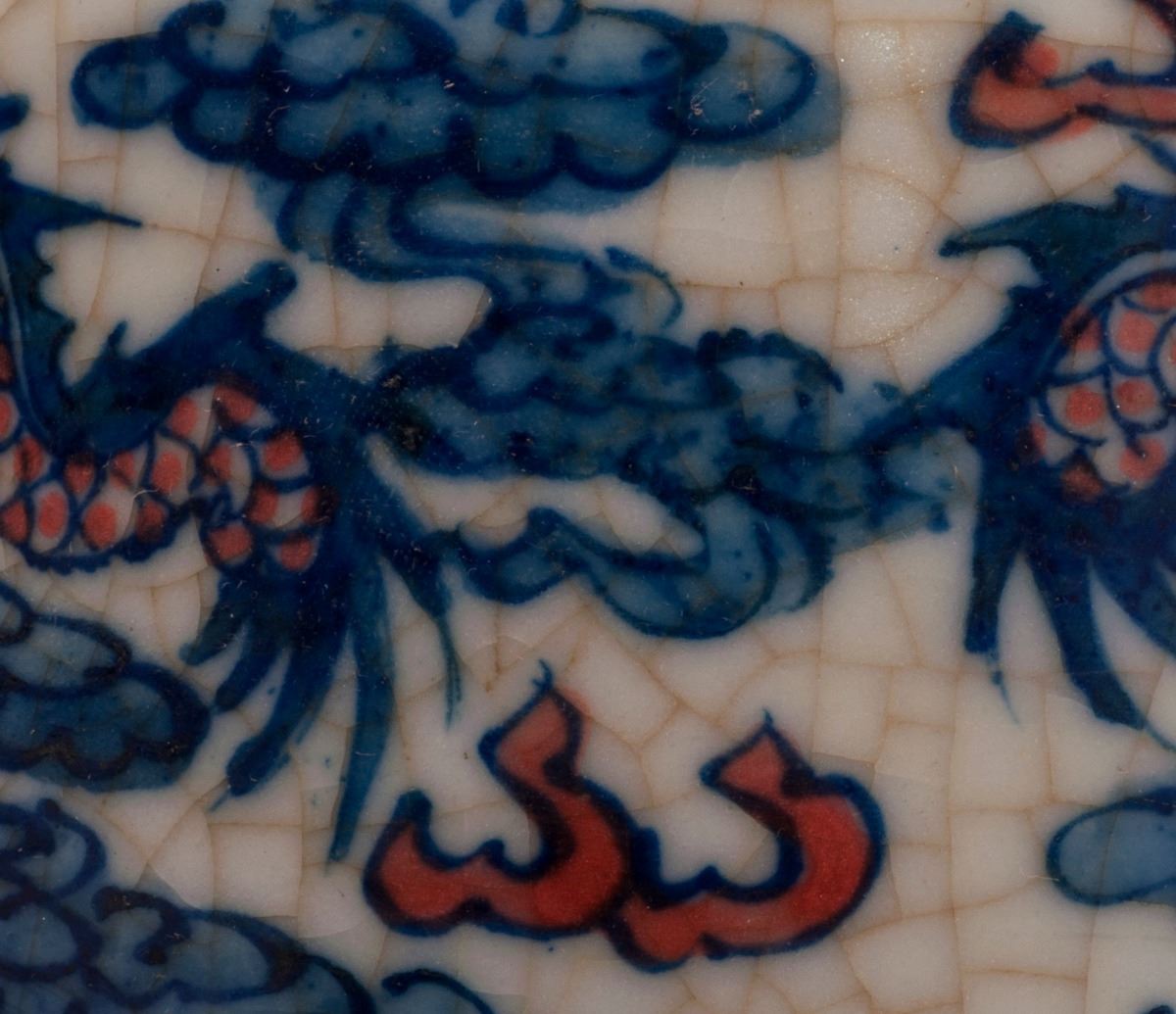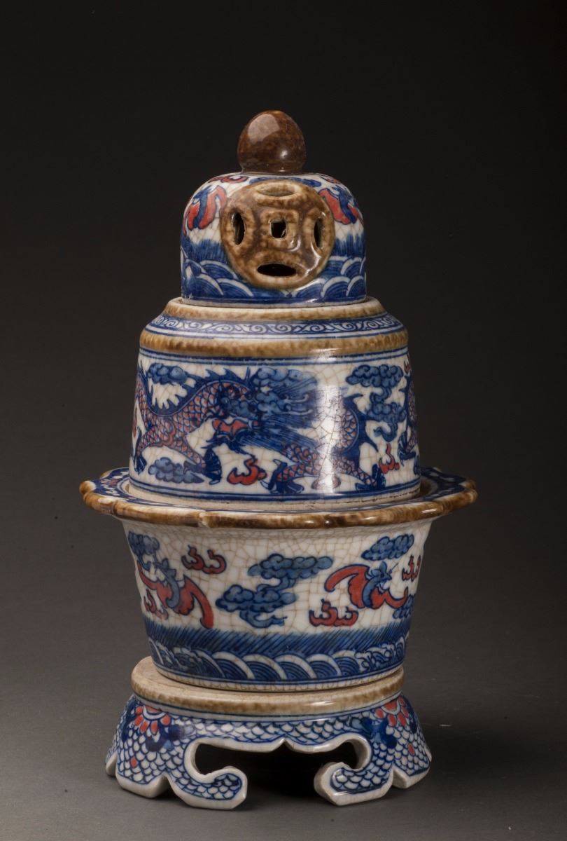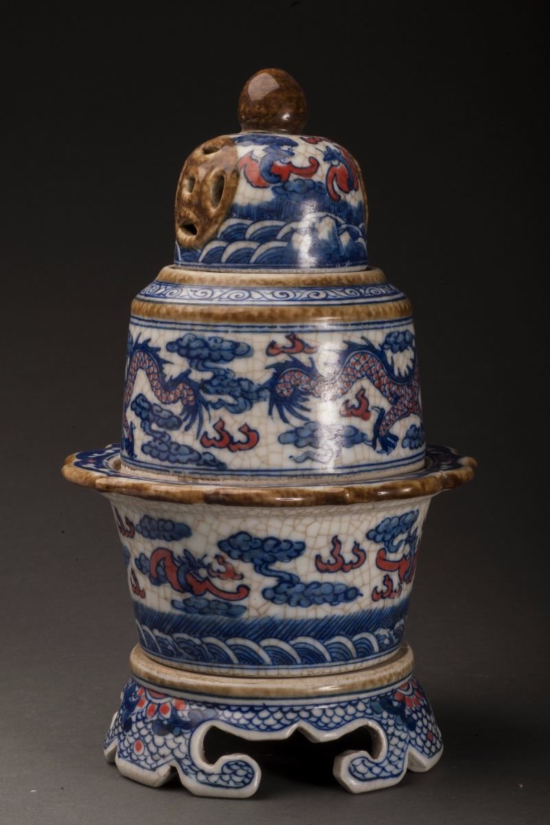 This Delicate Designed Porcelain Incense Burner With Vivid Dragon Patterns At Cavetto, The Cover With Fine Hollow Work And Vivid Sea Waves Patterns. Delicate Designed Legs At Bottom, Within The Form Of Vivid Waves, AndDecorated With Red Glazed Flower Patters.
