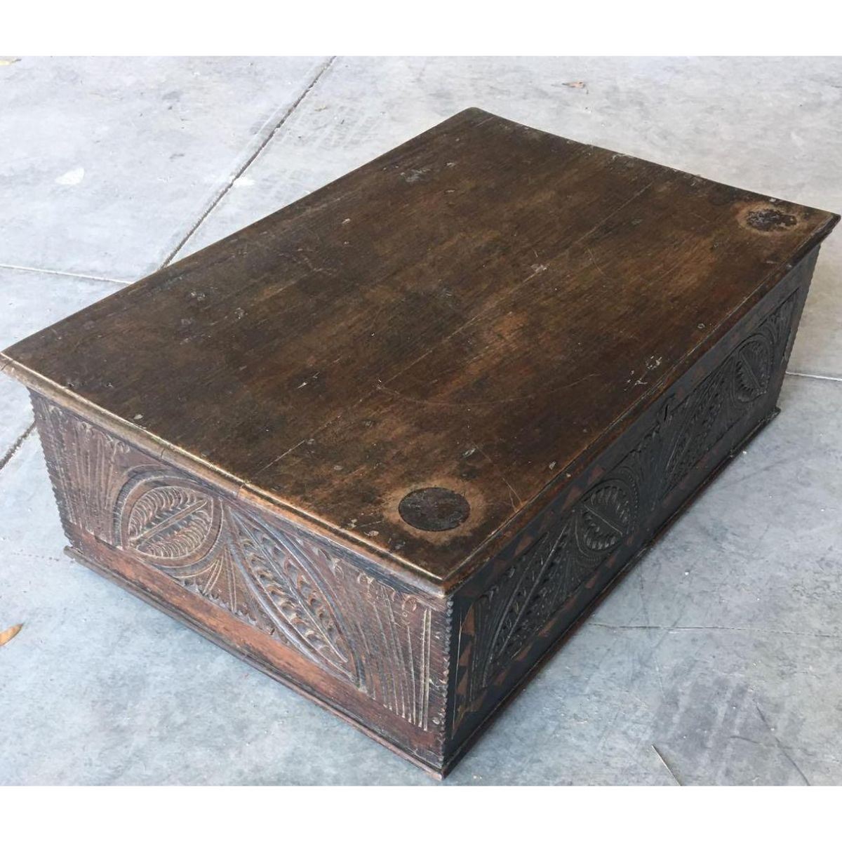 Mid 1600's - early 1700's English Cromwellian carved oak wooden coffer, chest, bible box. Original iron hinges & lock mechanism.Â