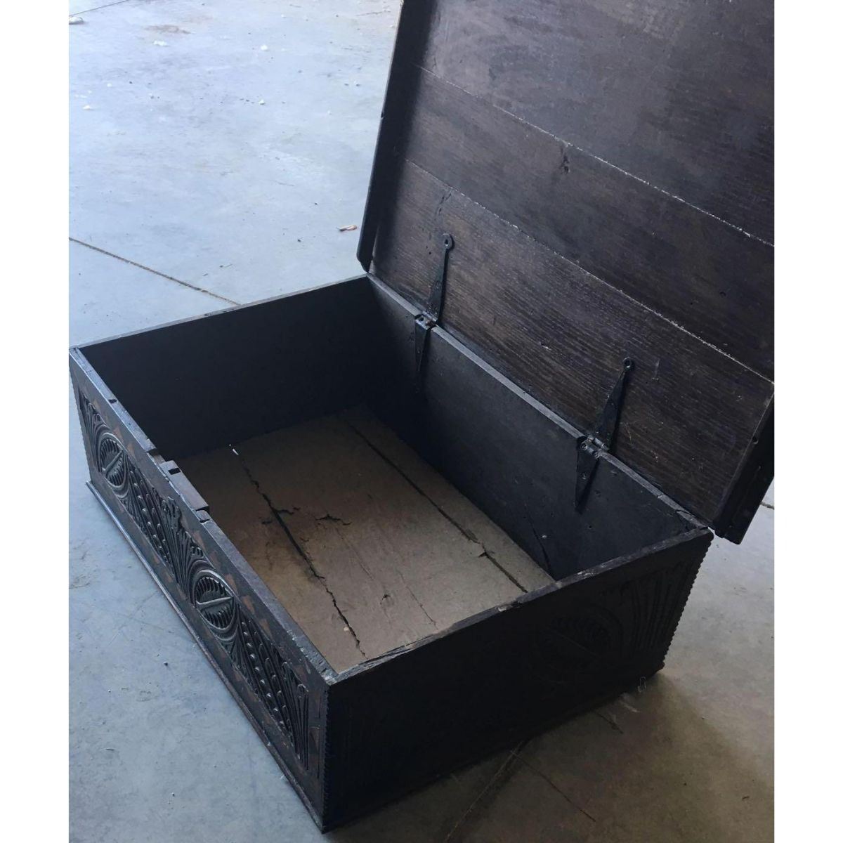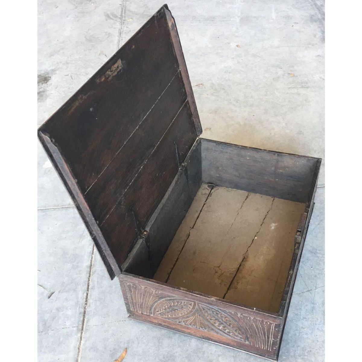 Mid 1600's - early 1700's English Cromwellian carved oak wooden coffer, chest, bible box. Original iron hinges & lock mechanism.Â