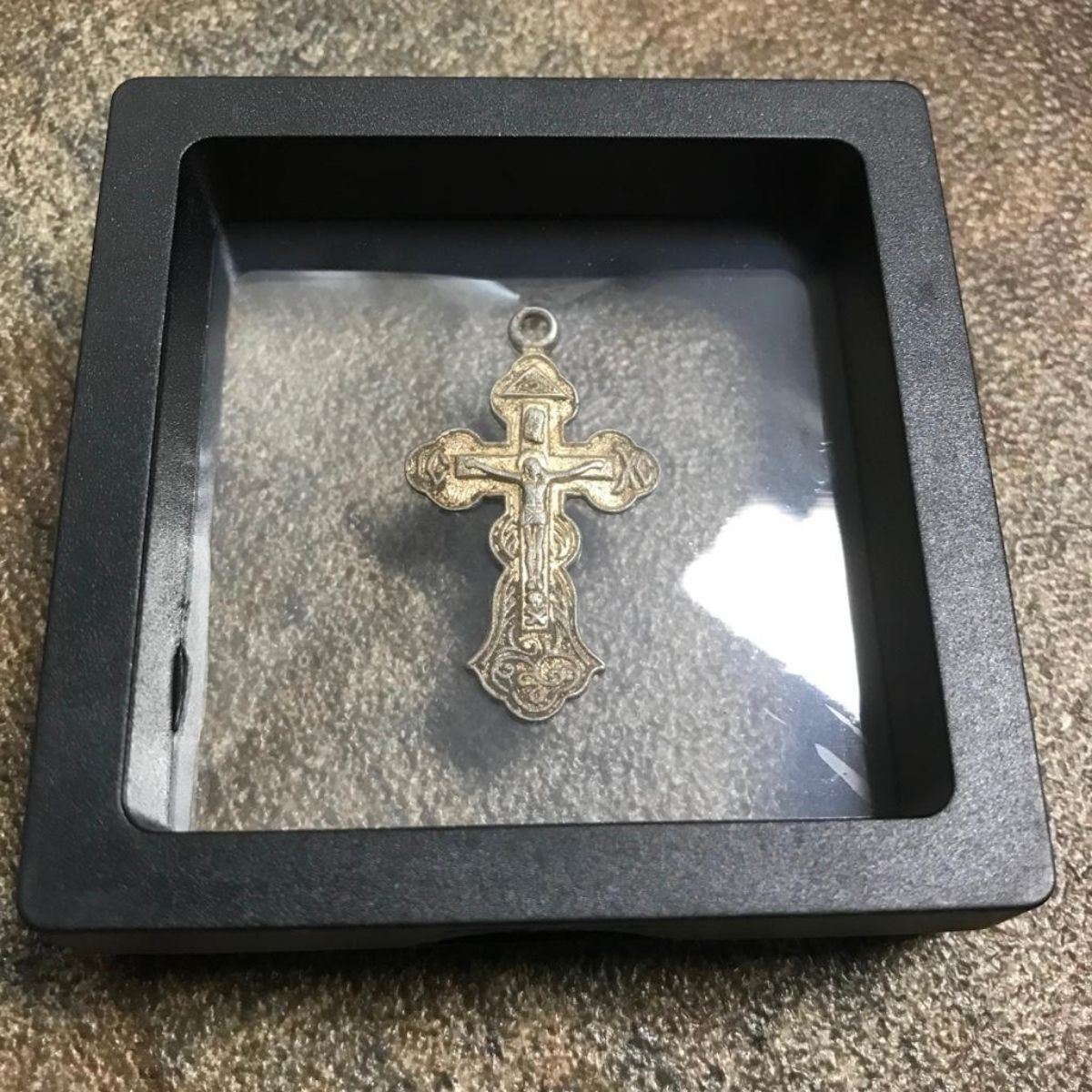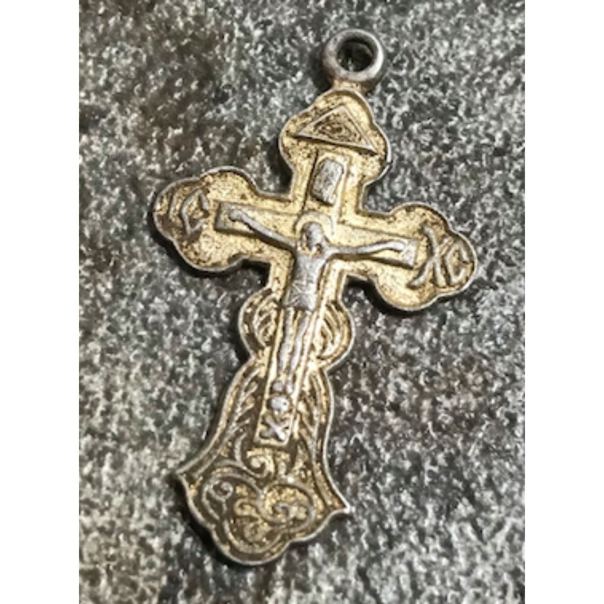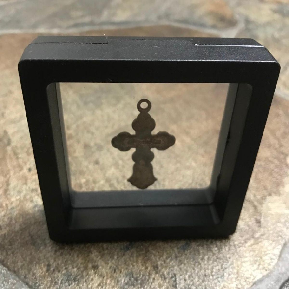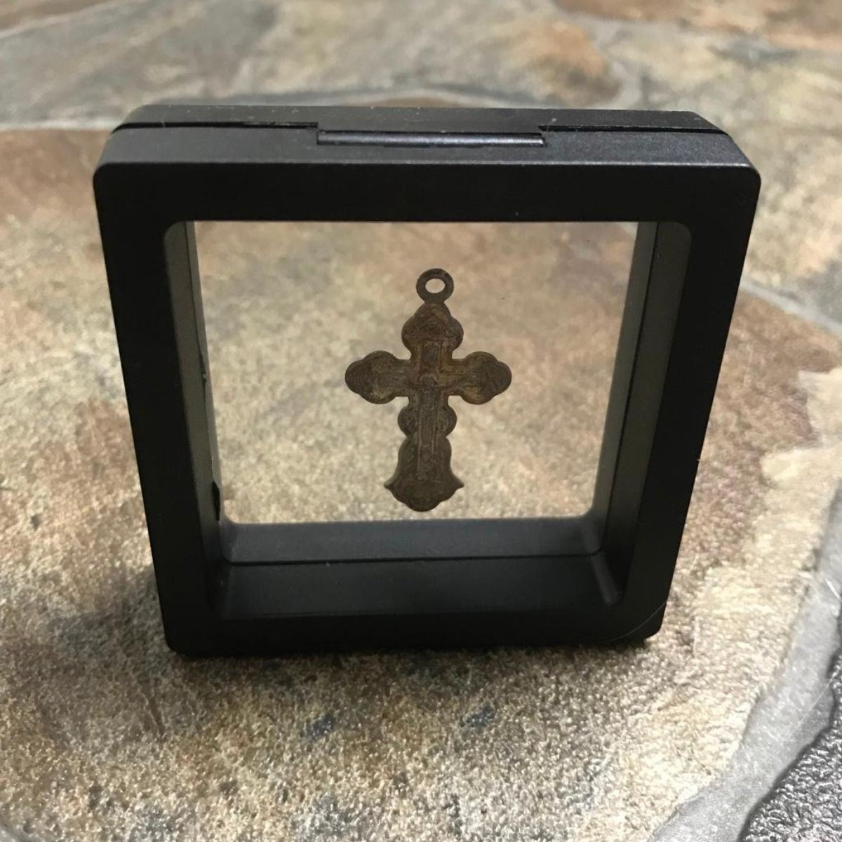 17th - 19th Century cross artifact. Ornate design with relief of Jesus & lettering on the reverse. Found via metal detector in Kharkiv, Ukraine. 46 x 30mm displayed within 2 1/2" X 2 1/2" small museum display case.