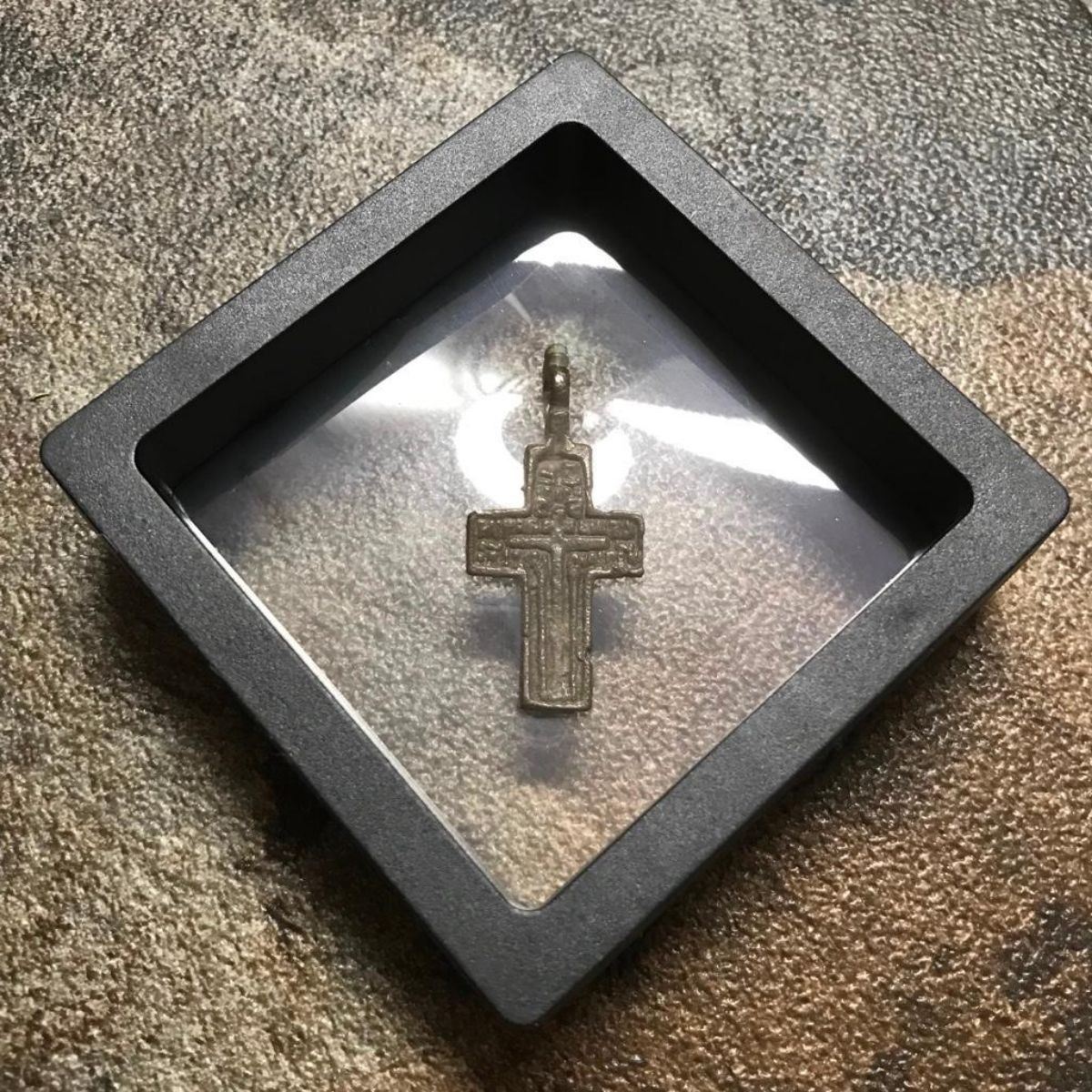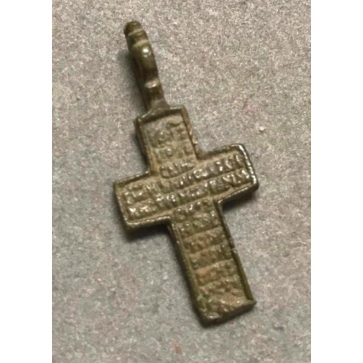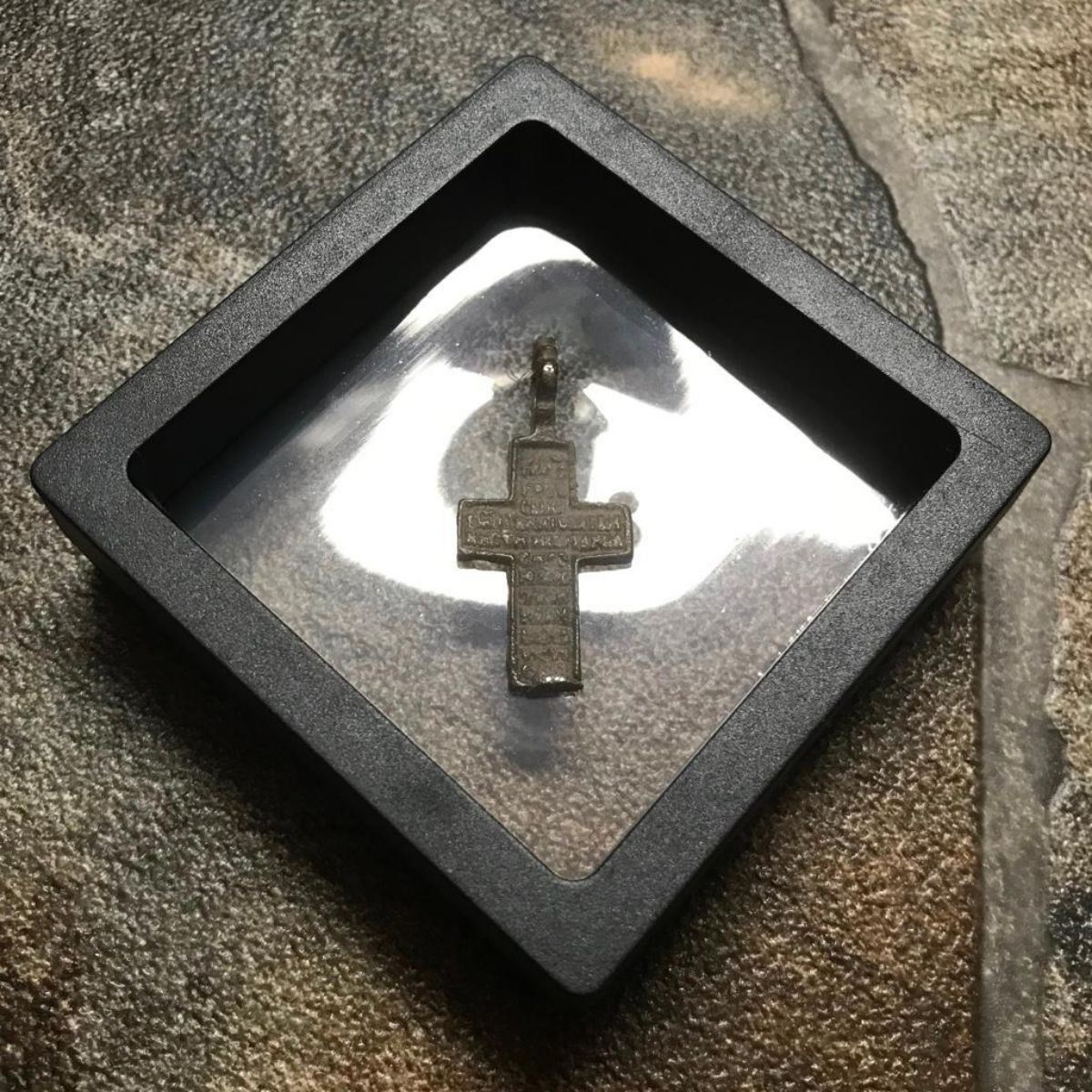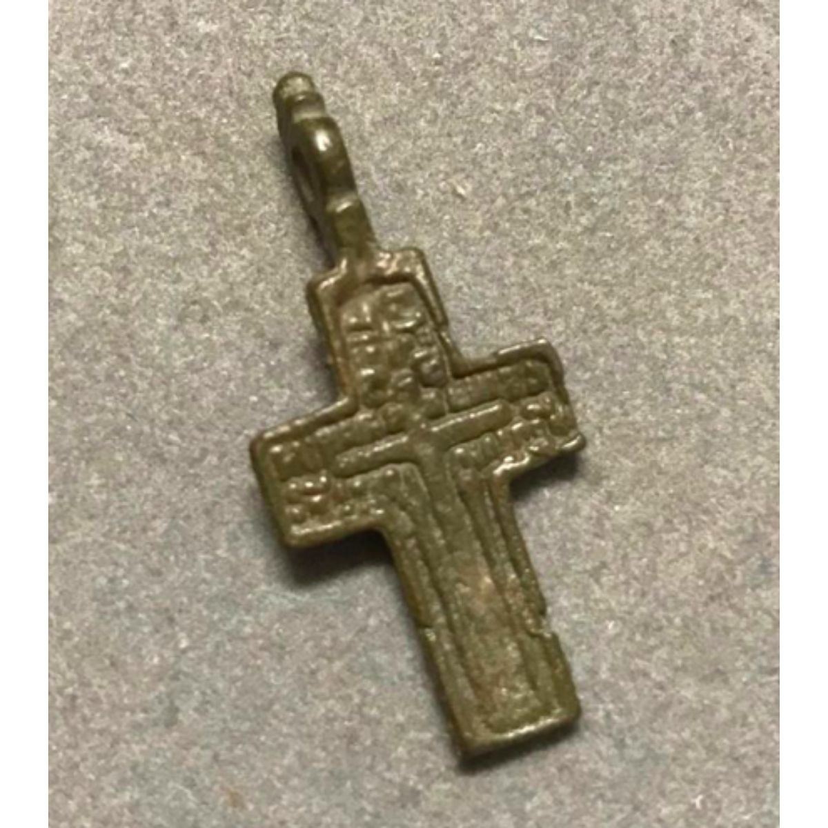 17th - 19th Century copper cross artifact. Found via metal detector in Kharkiv, Ukraine. 46 x 30mm displayed within 2 1/2" X 2 1/2" small museum display case. In good, wearable condition.Â