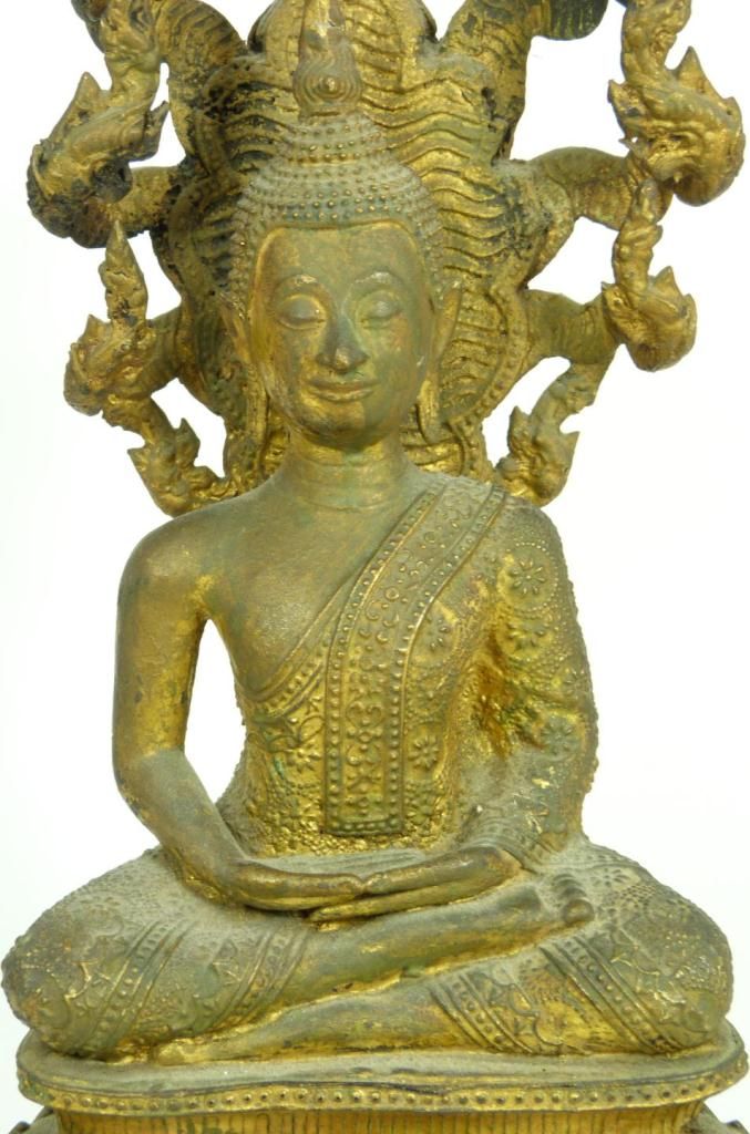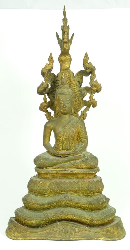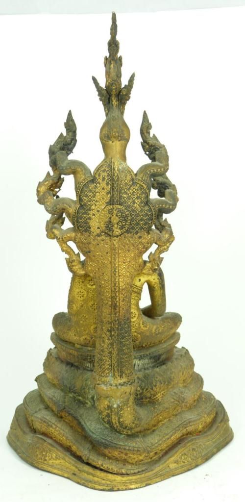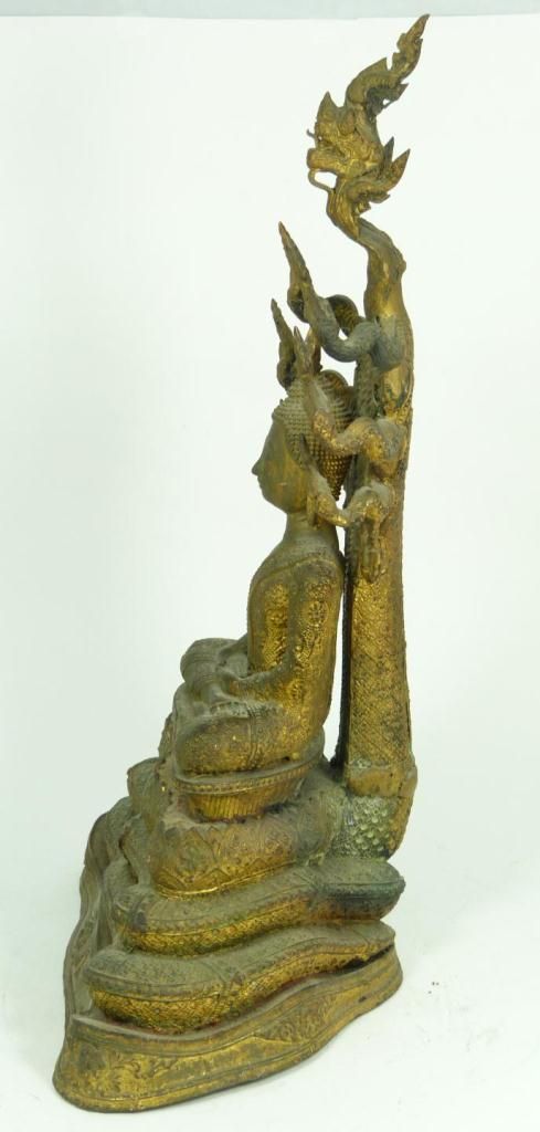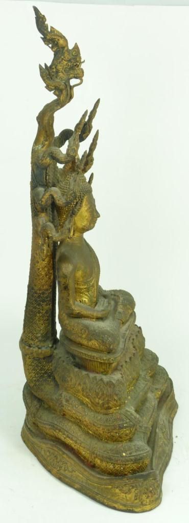 Antique Thai bronze figure depicting a seated Buddha with Naga head reaching up behind him. He is resting on the Naga's coiled body. Gilded throughout. Circa 17th century. Measures 18" height x 10" depth (45.7cm x 10" width). Total weight of 7.18 kilograms.