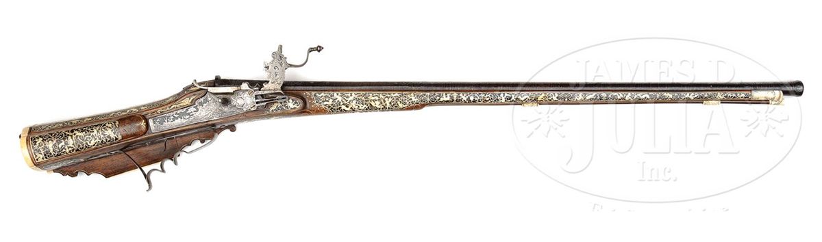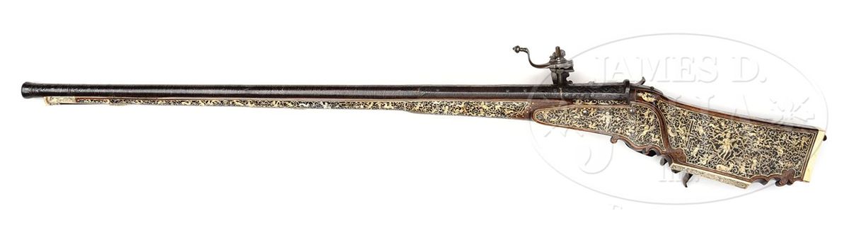 NSN. Splendid work of art wheel lock musket mounted with 16th century Ottoman bbl. Bbl of large bore, elaborately inlaid with heavy silver in arabesques and exhibiting superb Damascus pattern. Silver maker's stamp in recess towards breech. Many German guns were remounted with barrels from Ottoman guns captured at the siege of Vienna. The white stag horn inlay is unusually elaborate throughout butt stock and forend. Depicting fanciful animals, mythological dragons and winged angels blowing trumpets. Cheek piece inlay featuring a Roman hero surrounded by trumpet blowing putti and other figures. Patchbox decorated en suite and is original to gun, featuring angels, goats and satyrs. Lock is relief chiseled and engraved with recumbent figure resting after a hunt. Wheel lock is a piece of art. PROVENANCE: Collection of Clay P. Bedford. See related example James A. Rothschild collection at Waddesdon Manor. Collection of Dr. Douglas Sirkin. CONDITION: Overall good with inlays substantially intact throughout. Scrimshaw on white stag horn inlays still very crisp. Lock slightly worn with replaced pan and pan cover. Double set trigger needs adjustment. Bbl very crisp under old patination. Tang replaced during working life. 4-49769