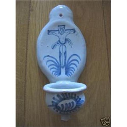 This is a really wonderful piece of Delftware. It dates to circa 1670. It is a wall plaque with a cup for holy water. This piece is in great condition. It measures 8" tall. It has a nice image on it. The only flaw is a small rim chip that has been filled in otherwise complete and in great condition for one of these.