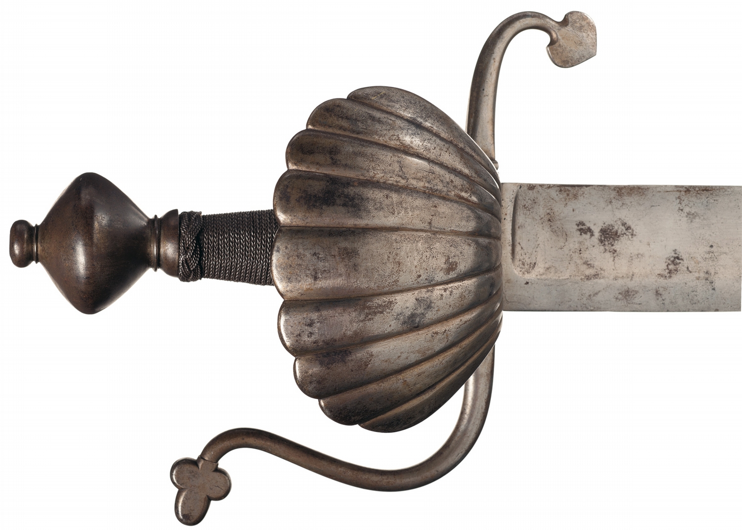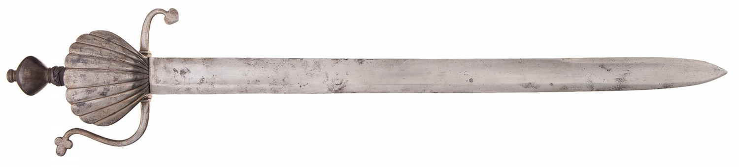 32 1/2 inches overall, with the blade measuring 26 3/4 inches long and 1 3/4 inches wide at the base, with a wide fuller running nearly the full length, flat spine, and an 8 inch false edge. No maker's marks are present. Dual curved quillions, with a cloverleaf at the tip of the long front quillion/ knuckle guard, and a spade on the upturned rear quillion. Guards are clamshell pattern, with a 3 3/4 inch long main guard and 2 inch reverse guard, with a wire wrapped grip section and flared pommel.