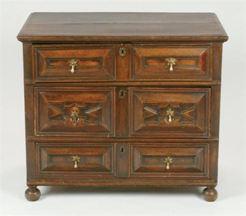 17th Century Oak Chest of Drawers a rectangular top above three panelled drawers raised on bun feet,
