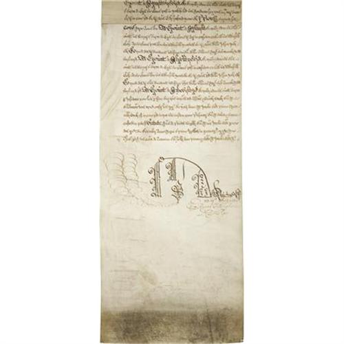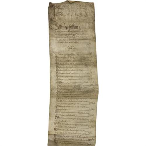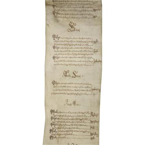 <B>17th Century English Parchment Scroll.</B></I> <BR> Four folio vellum sheets stitched end to end, 10.25 x 108.5 inches, July 1686.<BR>Impressive calligraphed parchment scroll accomplished in transitional Fraktur -Baroque Old Style font. Written in Latin, this lengthy untranslated document is heavily age darkened at the top and bears a large decorative design at the end. Penned during the reign of James II (House of Stuart), the second son of Charles I. Dated July 1686 and endorsed by "<I>Baron Fillingham</B></I>," whom research has failed to identify. <I>From the Robert and Diane Yaspan Collection.</B></I><BR><BR><b>Shipping:</b> Rolled Material (<a target="_blank" href="http://www.heritageauctions.com/common/shipping.php">view shipping information</a>)