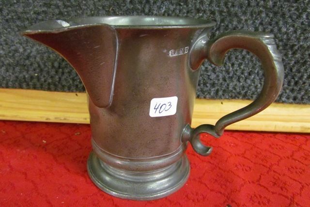 17th Century Pewter Pint Measure with spout, decorated handle marks on side