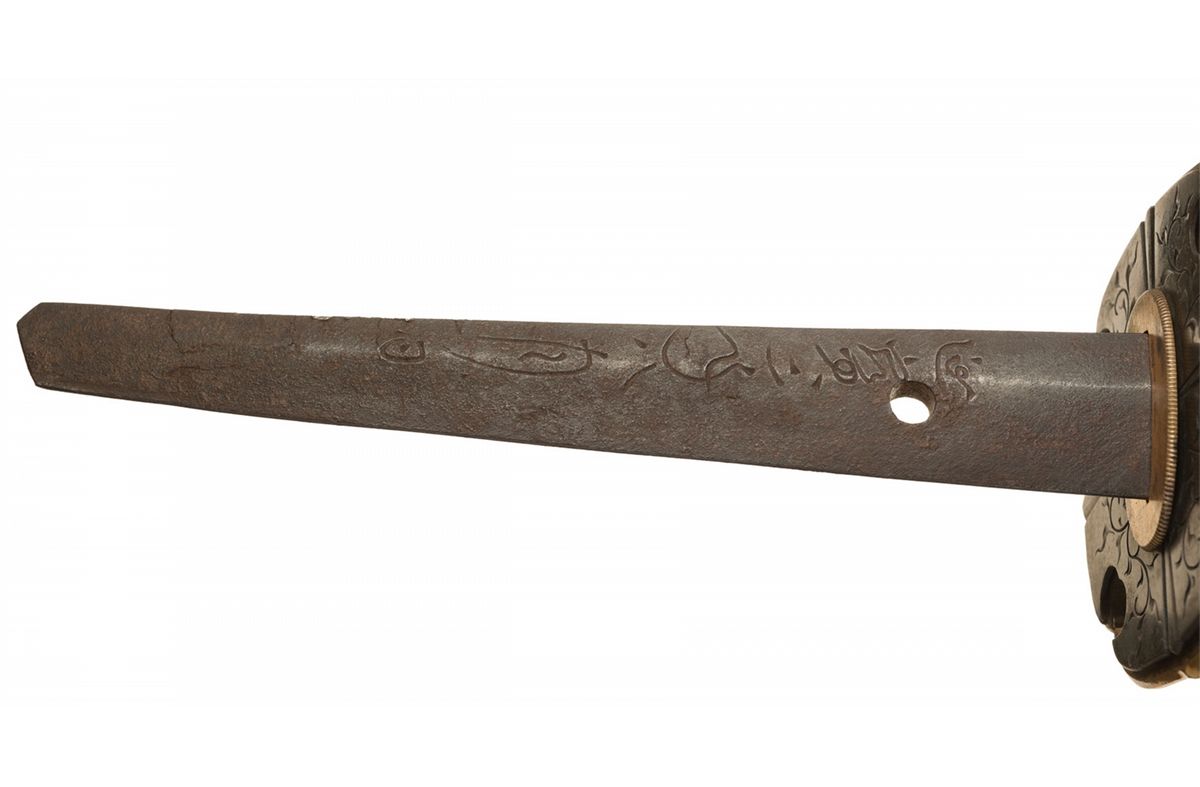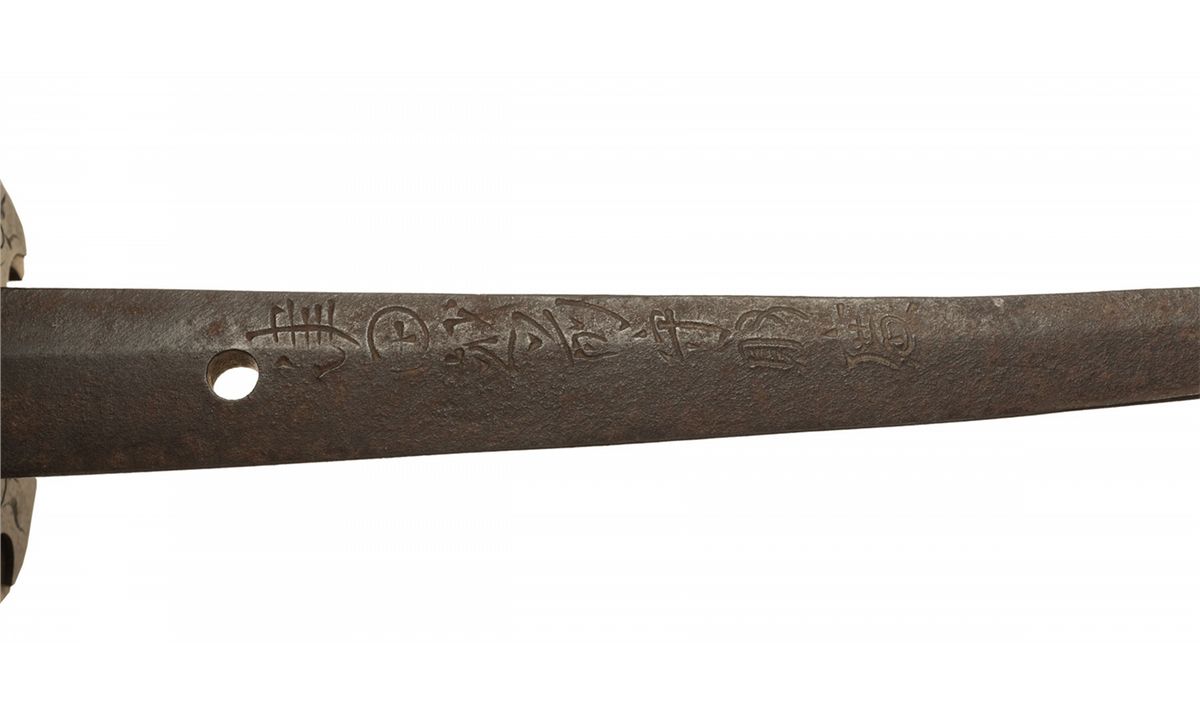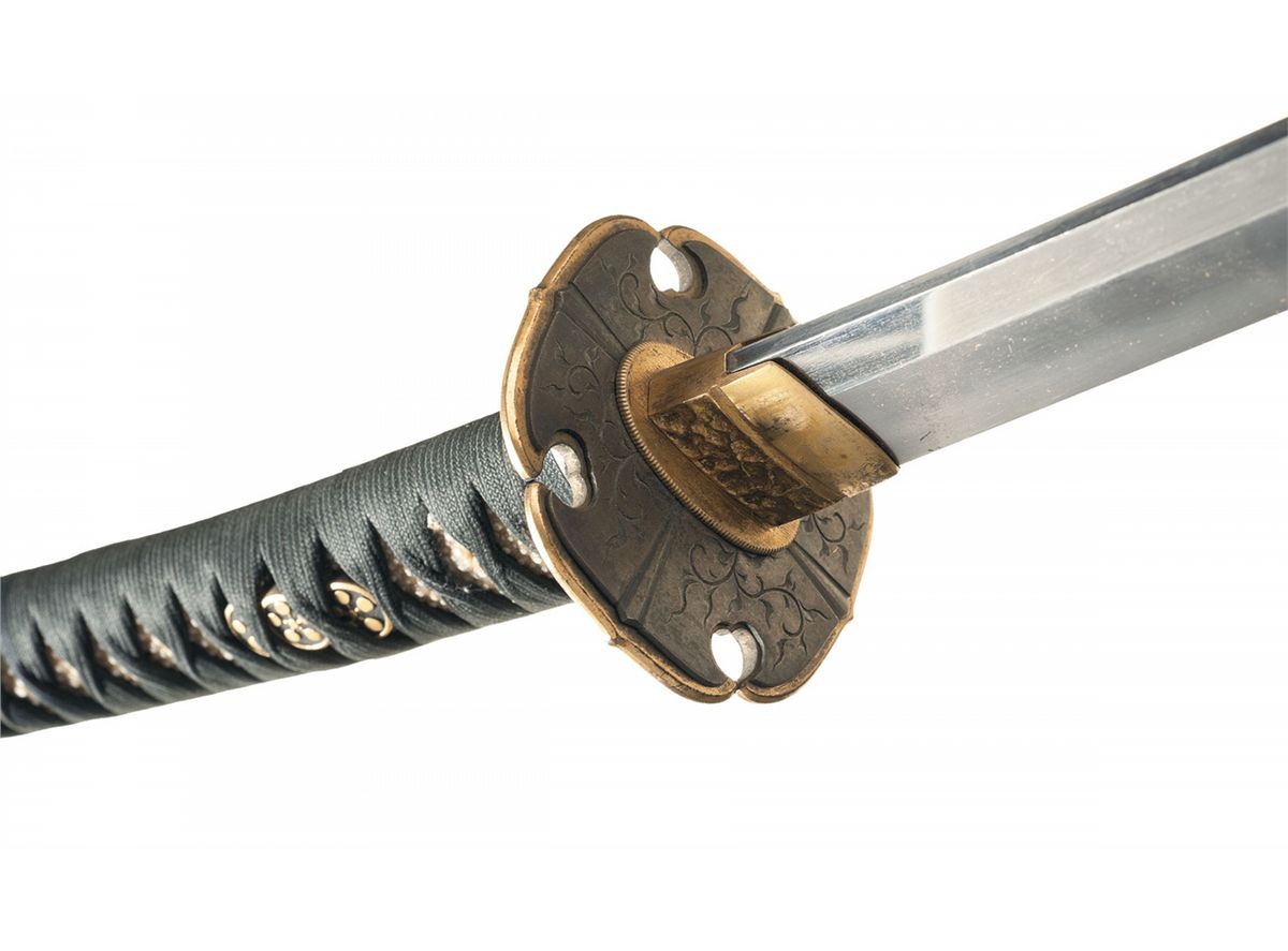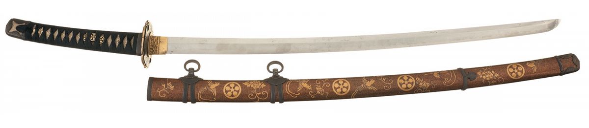 Measuring 34 1/2 inches overall, with a 24 1/2 inch blade, showing a choji pattern temper line and fitted with a gilt copper collar. The tang appears to be signed "Sukihiro", with a date that may be "1673". Gilt 4-lobed tsuba, with matching contoured engraved sentoku plates, tachi style hilt and sentoku fittings. The menuki are similar to the military pattern, with a mon consisting of 5 circles connected by spokes to a central circle in place of the mum. The mon is repeated in gold lacquer on a speckled hiramaki background on the saya, along with floral designs and ho-oh birds, and sentoku fittings.