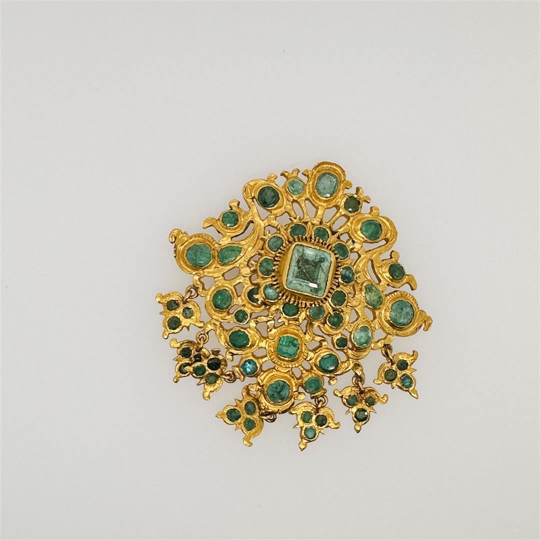 17th century Spanish 22K Gold Medallion set with numerous old cut emeralds, the back finely engraved allover; as-is condition with some chips to emeralds and losses; gross weight 33.6g, L 2 1/2 inches (approx.)