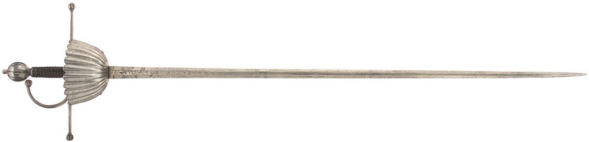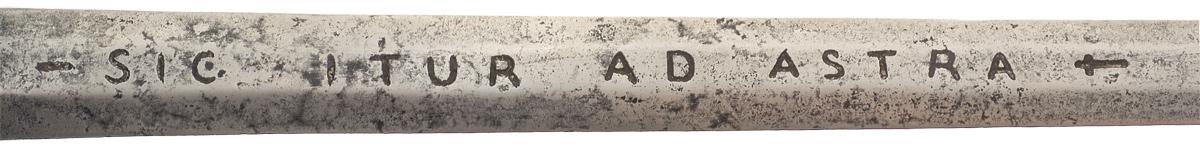 Blade measures 40 3/4" from the guard to the hilt, with tapered double edges and the inscription "SIC ATUR AD ASTRA" on each side, flanked by a dash and a cross. A Latin phrase, translated alternately as "a path to the stars" or "thus you shall go to the stars", is attributed to Virgil's epic poem The Aeneid, and has been adopted as a motto by a number of modern organizations. Resting atop a pair of curved forearms is a fluted cup hilt, measuring 5 1/2" across and approximately 2 9/10" tall, with a pair of rivets securing the forearms and a rough surface on the underside. The hilt additionally features straight double ricassos, 11 1/2" from tip to tip, a single bar knuckleguard, and a large ball pommel, all with fluted ball tips, and a woven wire pattern grip.